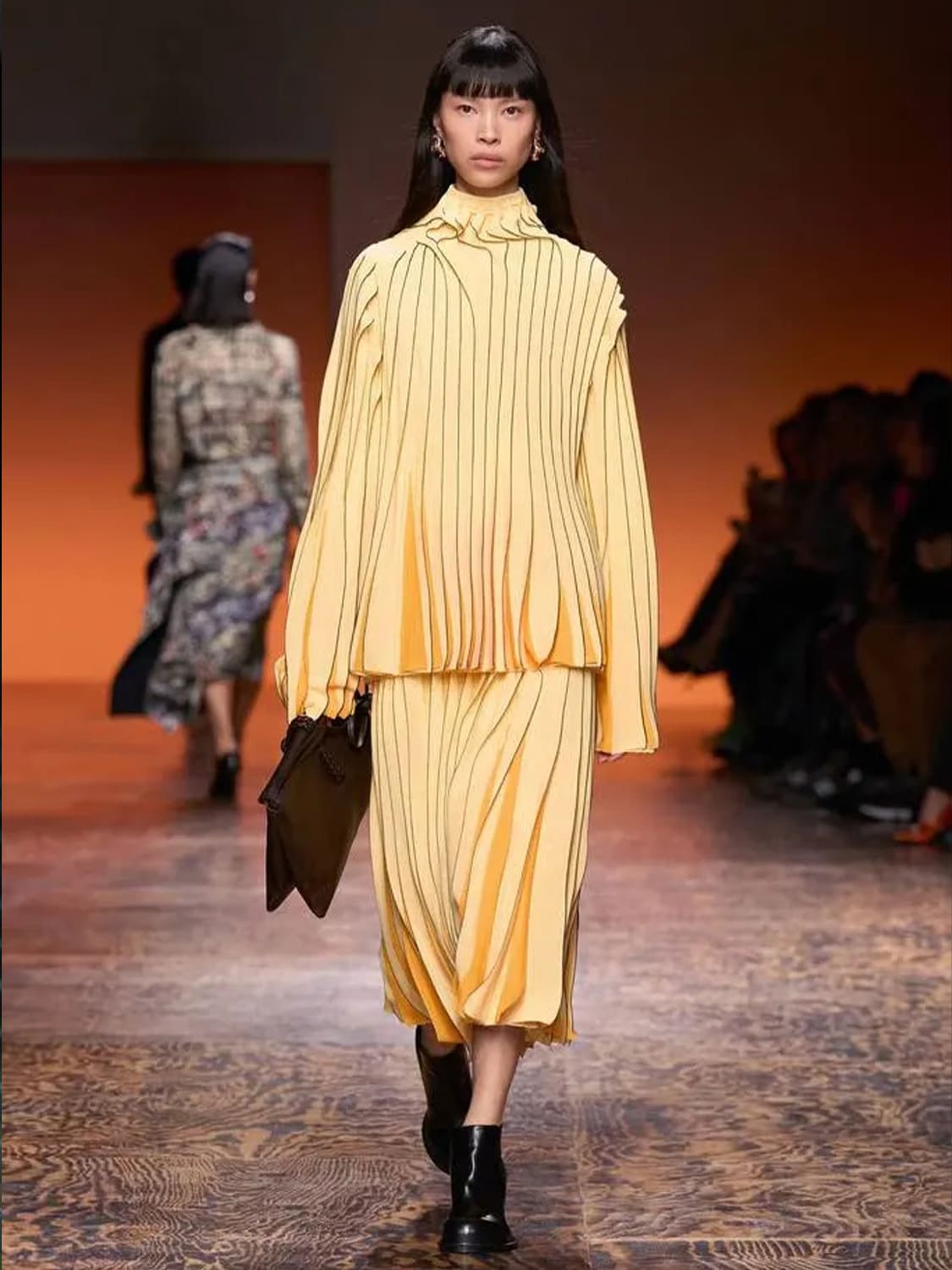 This fall sees a dramatic shift from the muted tones of previous seasons to bold and vibrant shades. Designers are embracing chromotherapy in the use of bright hues like red and yellow, which can help boost energy, especially for those who are feeling unmotivated and sloth-like as the year crawls to a close. Vibrant colours, which is often seen in oversized coats, tailored suits, and statement pieces, allow wearers to make a striking impression and express a mood. Look out for monochromatic outfits or colourful layering blocks, such as those which Dries Van Noten showed in his masterful final collection for the label, to top the colour charts.