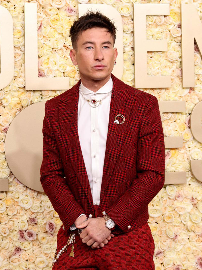 All eyes were on Barry Keoghan, who wore a striking red suit by Louis Vuitton, pearl necklace from Tiffany & Co, and an Omega Aqua Terra Sedna Gold timepiece featuring marquise-cut red rubies.