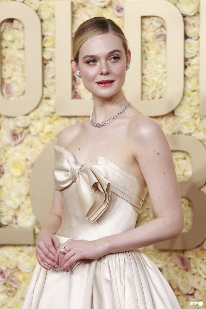 Elle Fanning is the picture of timeless elegance in a vintage Pierre Balmain gown and Cartier jewellery.