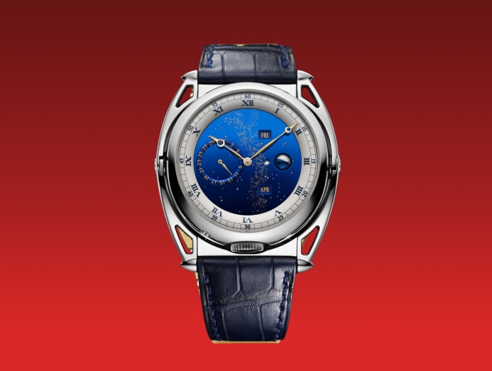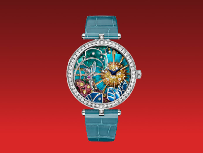 The Lady Jour Nuit offers a gradual depiction of the sky’s passage, but for something more dynamic, consider Van Cleef & Arpels’ Lady Arpels Brise d’ete, meaning “summer breeze” in French. Its blue and yellow plique-a-jour enamel butterflies serve as hour and minute indicators, while a pusher at 8 o’clock brings the dial to life, sending the butterflies flitting around the dial as three flowers gently sway in an invisible wind.