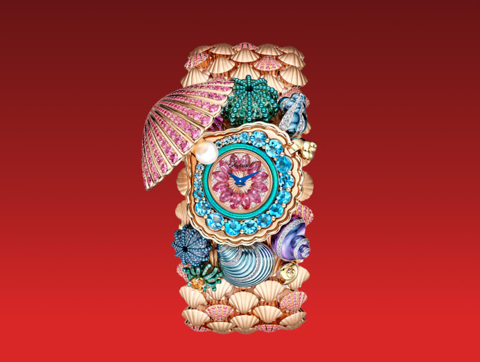 Chopard’s one-of-a-kind cuff watch from this year’s Red Carpet collection is an oceanic odyssey, brought to life by the whimsical vision of Caroline Scheufele. The actual timepiece is hidden under a seashell, with a medley of coloured sapphires glittering around the dial and a natural pearl concealing the hinge. The cuff itself is blanketed in emeralds, diamonds, as well as purple, Demantoid, and mandarin garnets set in ethical 18K white gold, pink gold, and titanium. This masterpiece required over 1,000 hours to create.