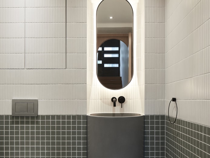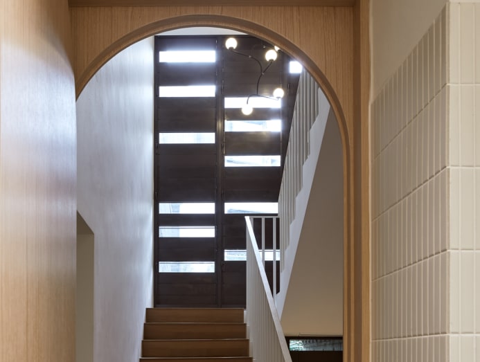 Teh applied the same material and colour palette throughout to unify all four storeys. “Kit Kat” tiles and mosaics dress the kitchen and bathrooms; timber parquet, cabinetry and half-wall cladding in the main living area echo the feel of nature outside the windows; and a gentle moss shade colours the bottom half of corridor and room walls to break the monotony of white walls, while channelling greenery in abstract.