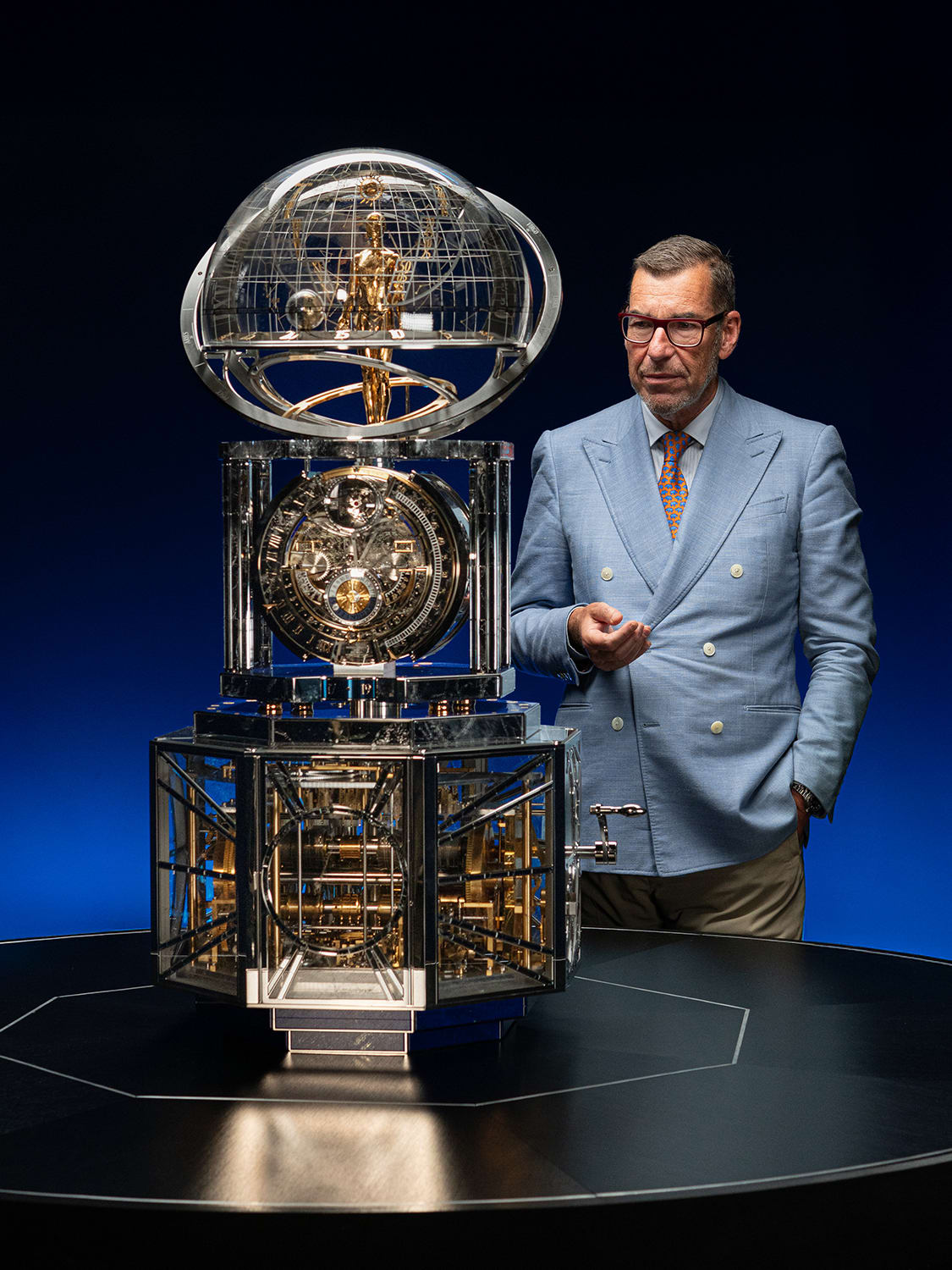 Everything starts with La Quete du Temps, the clock that inspired the watch. This extraordinary creation, which took us seven years to complete, was initially imagined as a more modest table clock, but it evolved into a monumental piece that’s as tall as a person.