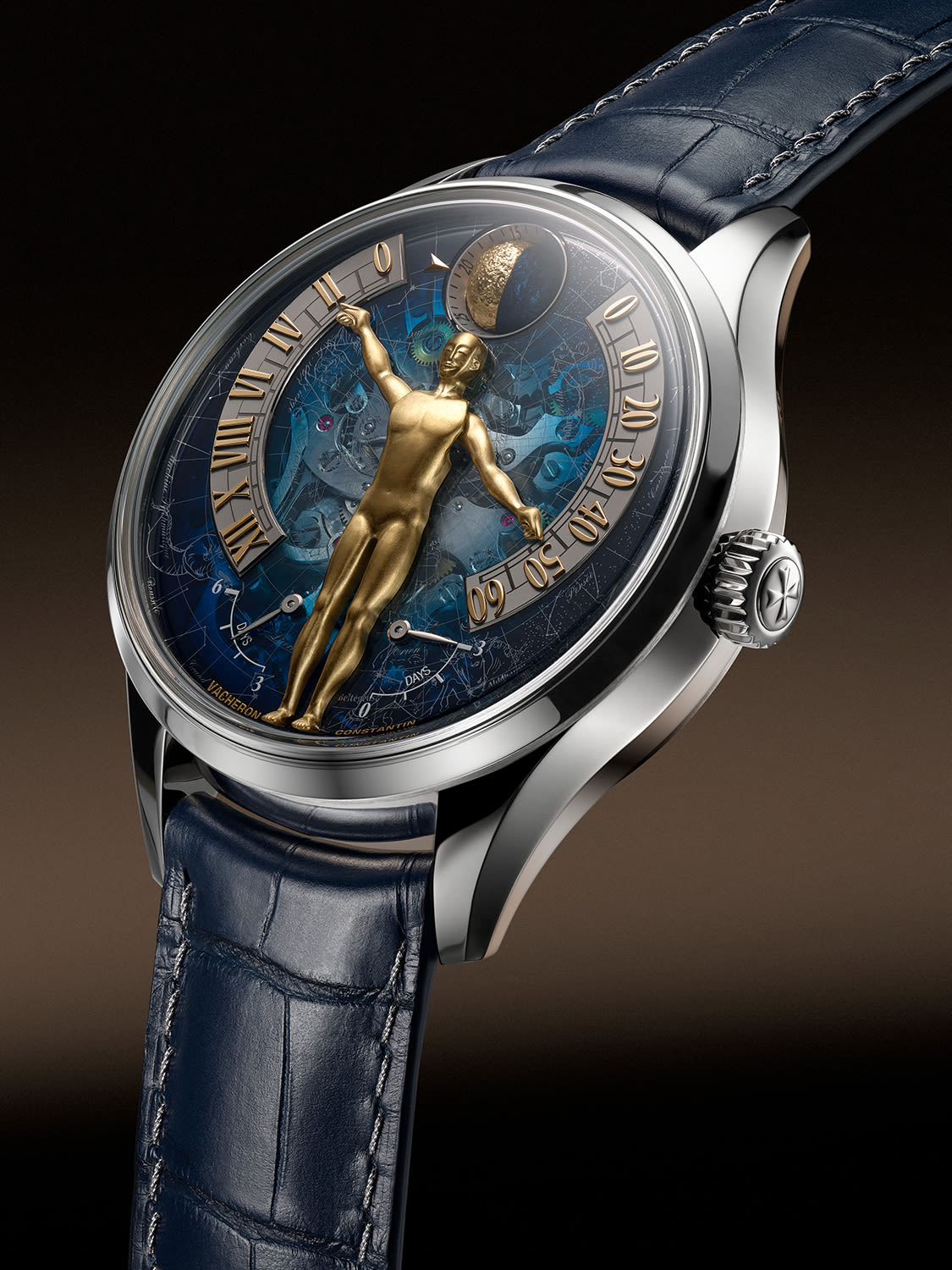 On the front, a golden titanium figure – crafted using traditional hand-finishing and contemporary decorative techniques – lifts its arms in a double-retrograde display to indicate the hours and minutes. This modern reinterpretation of the maison’s 1930 bras en l’air pocket watches also serves as a showcase of Vacheron Constantin’s metiers d’art savoir-faire. The figure is set against a graduated blue, metallised sapphire backdrop depicting the constellations above Geneva on the day of the maison’s founding in 1755, while the reverse side features a laser-engraved celestial map that mirrors that same night sky, accurate to within one day over more than 9,000 years.