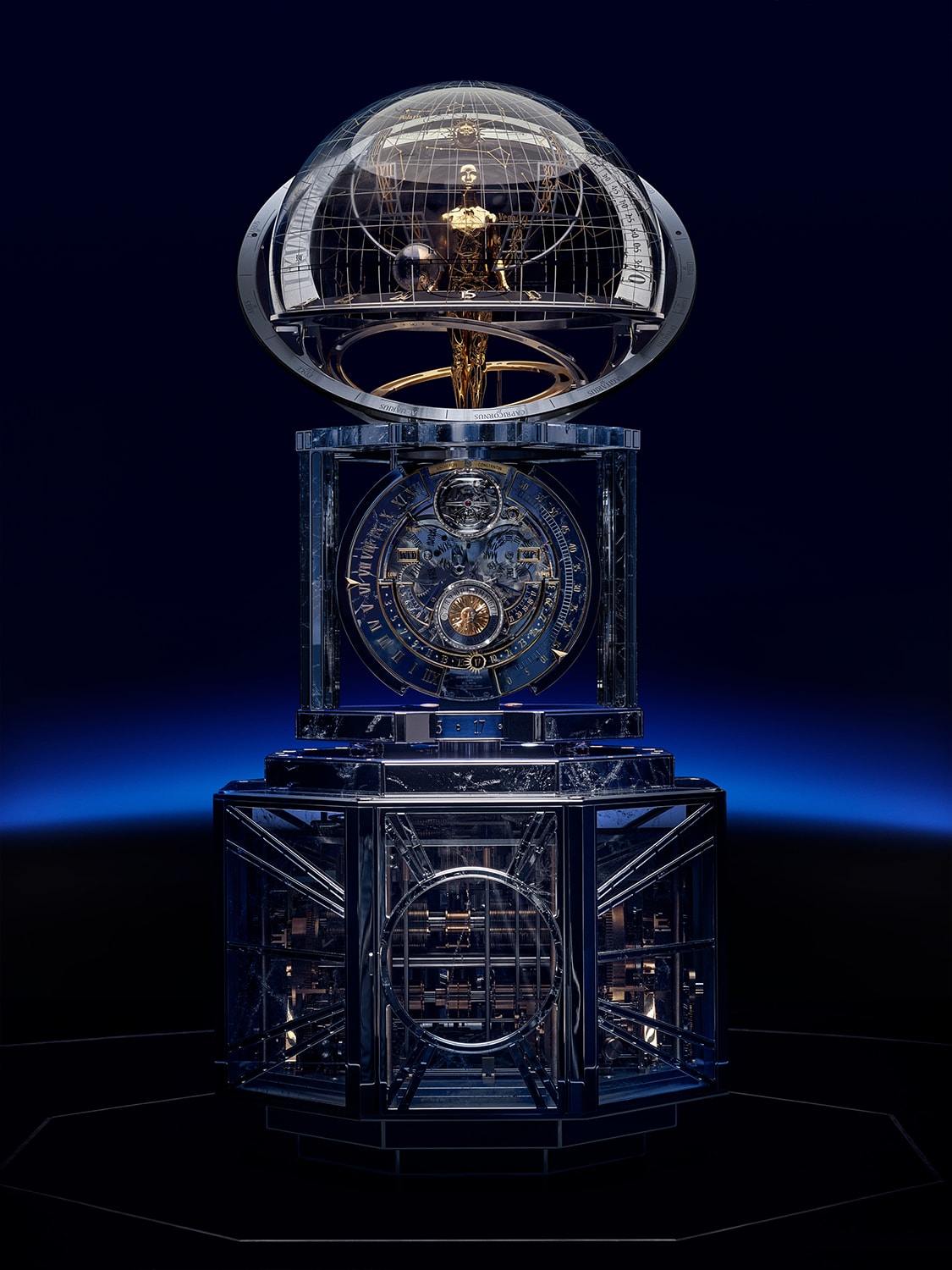Seven years in the making, this astronomical creation is a collaborative symphony of artisanship and science. Within its crystalline dome stands the automaton, the Astronomer, whose fluid, almost human-like movements are powered by an intricate system of 158 cams and a mechanical memory that synchronises with a 23-complication clock beneath it. The Astronomer gestures and looks towards celestial spheres, the moon, and the division between night and day, while music composed by Grammy-winning French musician, producer and director Woodkid resonates through the automaton’s base, transforming time into an emotional performance