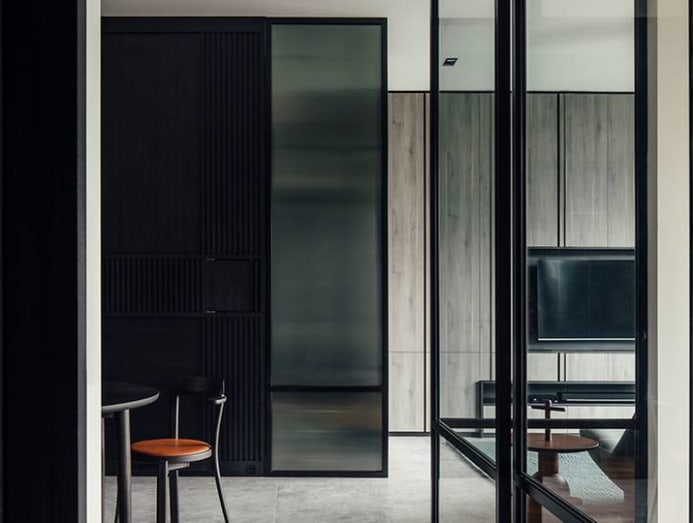 While there are many dark planes, the home feels more cosy than sombre. Khu replaced a part of the front bedroom wall with glass panels and a sliding glass door, which floods the common areas with natural light. It also gives the dining room a view out to the balcony beyond the bedroom.