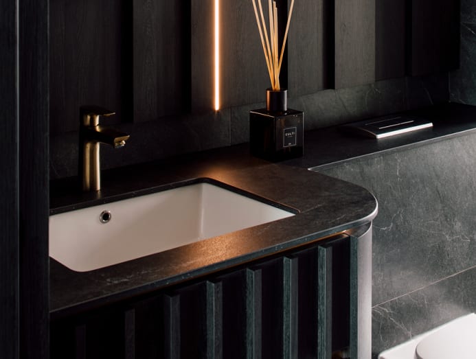 Together with the dark tones, high-gloss accents throughout the home add a sense of sophistication. These are found in the bathroom and kitchen joinery, and elements such as the bronze-finished faucet in the powder room, which Khu did up glamorously in expectation of guest usage.