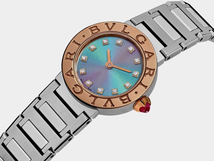 Released on Jan 14, the Bvlgari Bvlgari x Lisa watch is crafted in steel and rose gold. It features a striking multi-coloured dial with blue, green and hints of purple creating a rainbow effect. Twelve diamonds mark the hours, complemented by rose gold hands. The crown is topped by a cabochon-cut rubellite, one of Bvlgari’s aesthetic signatures.