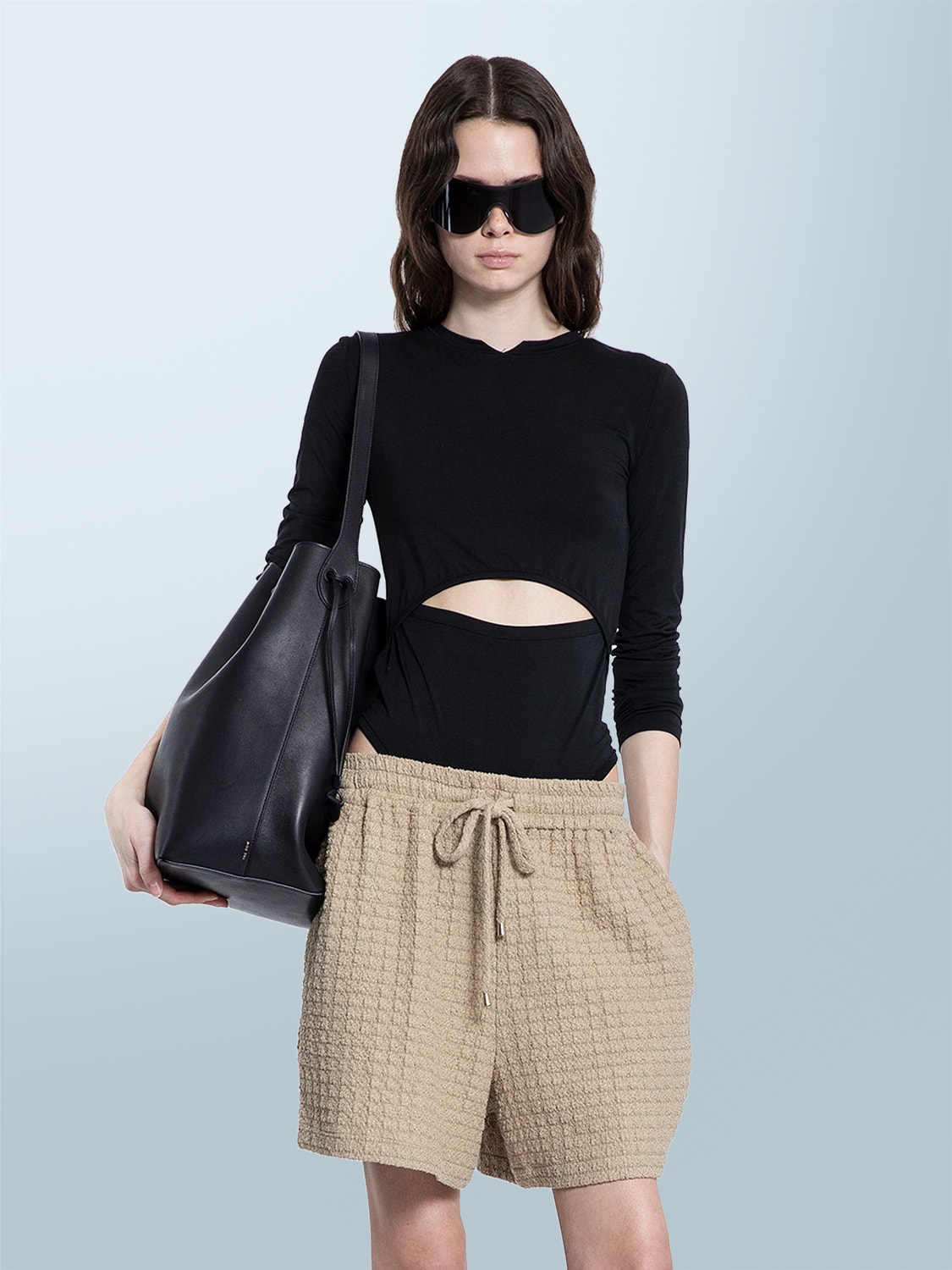 Because these aren't one-off runway experiments. They are thoughtfully conceived staples: Unisex bombers, joggers, stretch ribbed linen tees, wetsuits, mix and match bikinis, silk-tencel lounge dresses, and thin cashmere tops that don't punish the wearer for daring to sit in economy class for eight hours.