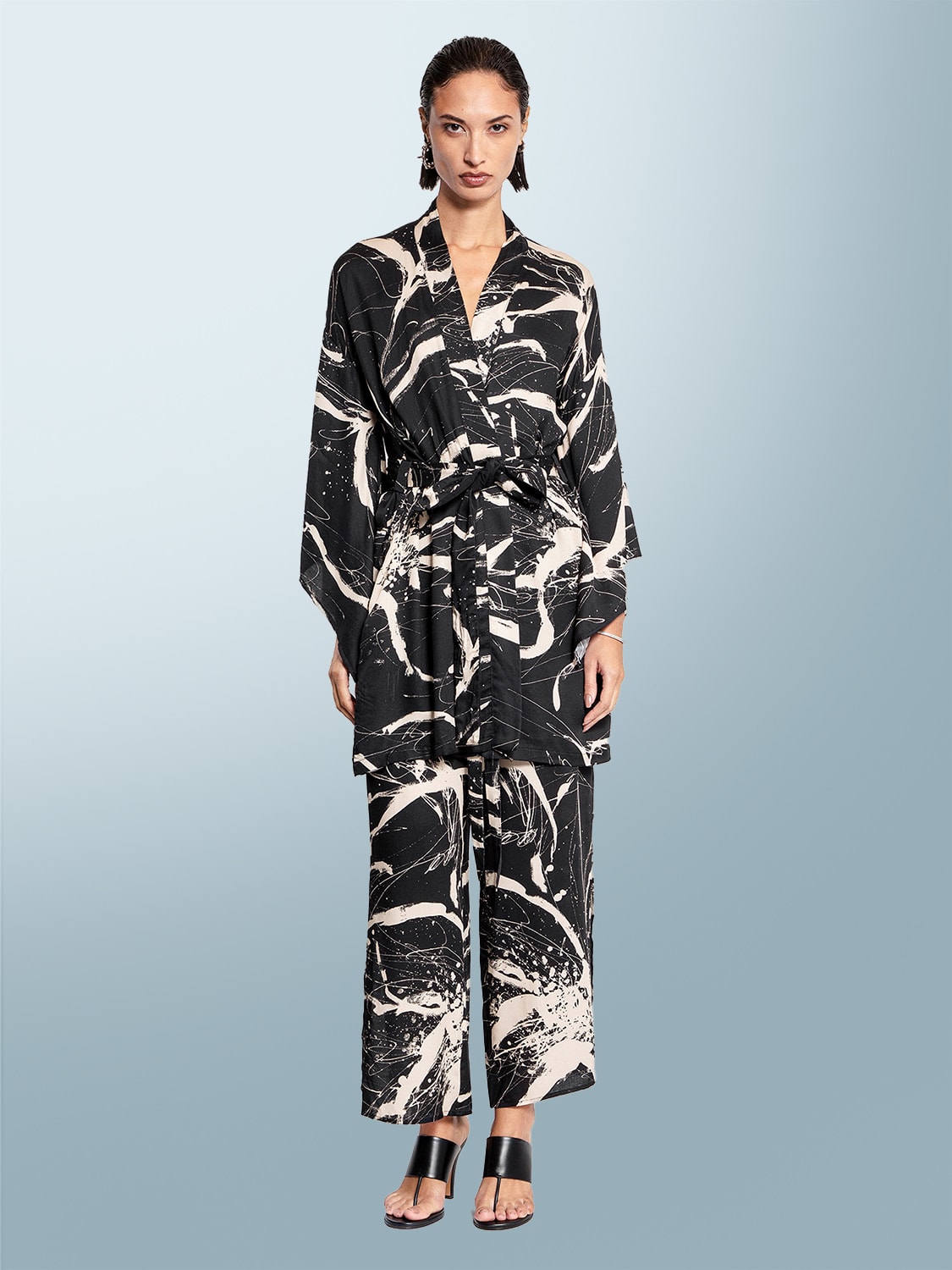 Another piece that stands out is a black backless gown versatile enough to transition from beach club to dance club — solving that eternal vacation dilemma of packing separate wardrobes for day and night. There's also a sinewy kimono featuring white splashes on black silk inspired by Crosswhite’s grandfather’s calligraphy, bringing personal history into what could otherwise be just another beach cover-up destined for the "never wore it again" pile.