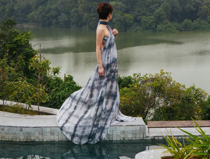 "I travel so much for work, and I wanted to do a wardrobe that could travel with me," Crosswhite explained during Lisa Von Tang preview in one of the pod suites in the newly minted Mandai Rainforest Resort by Banyan Tree. Instead of the usual runway setup, her pieces are casually draped over furniture in the bedroom and outdoor timber deck, and hanging in the bathroom closet. Not a model is in sight — a subliminal acknowledgment that even beautifully designed clothes eventually have to exist in the messy reality of an actual home.