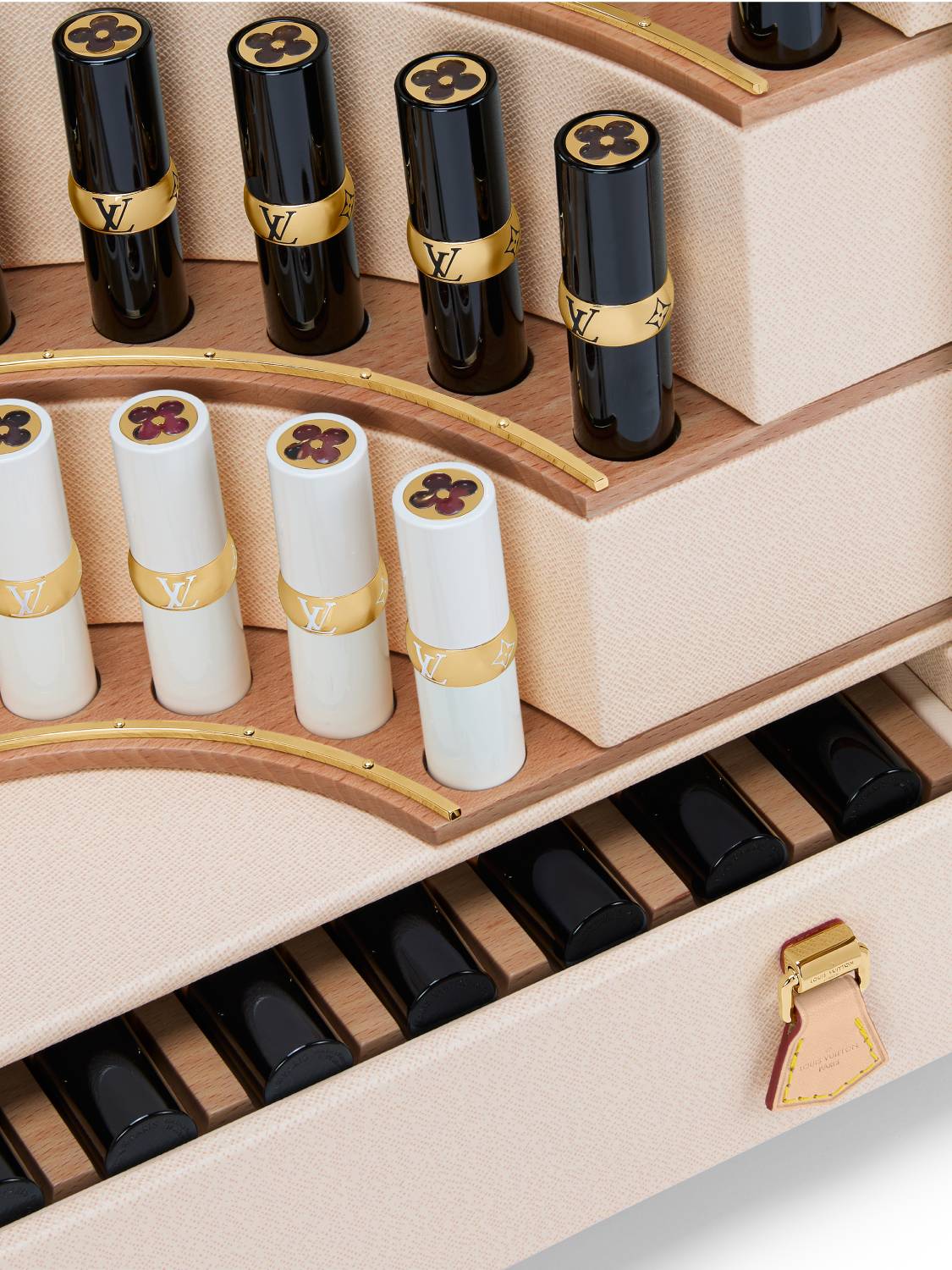 Two things stand out in his presentation of the La Beaute collection. The golden ring – a detail that is inspired by the brass fittings of LV’s iconic trunks – is a nod to heritage and a powerful marker of identity that carries throughout the beauty line.