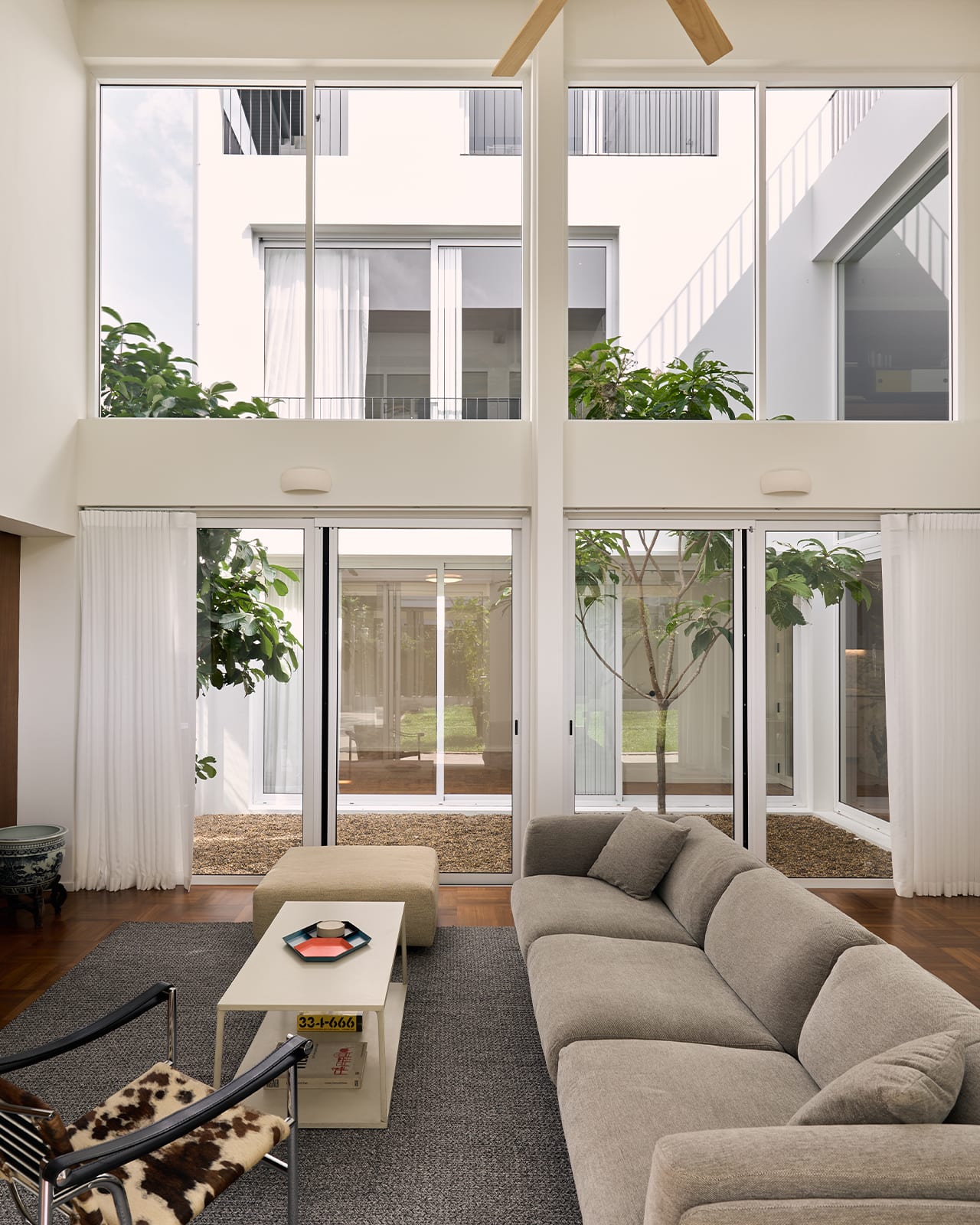 The first storey of the original house now boasts a capacious double-volume living room, connected to the dining room by a sliding door. From there, another sliding door leads to the pantry and kitchen, in the rear extension.