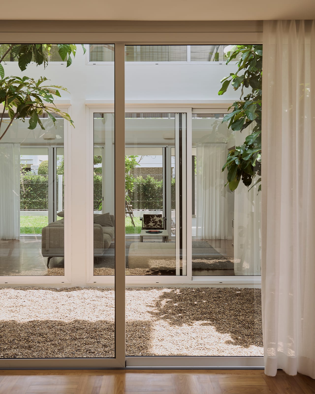 These interconnected spaces are ideal for gatherings. Together, they can accommodate up to 20 people. “This is now the heart of the home,” said Chooduang. Between the old house and the extension, he inserted a small garden that draws daylight deep into the interior. The living room in the old house and the family room in the extension share the same view of this sliver of greenery.