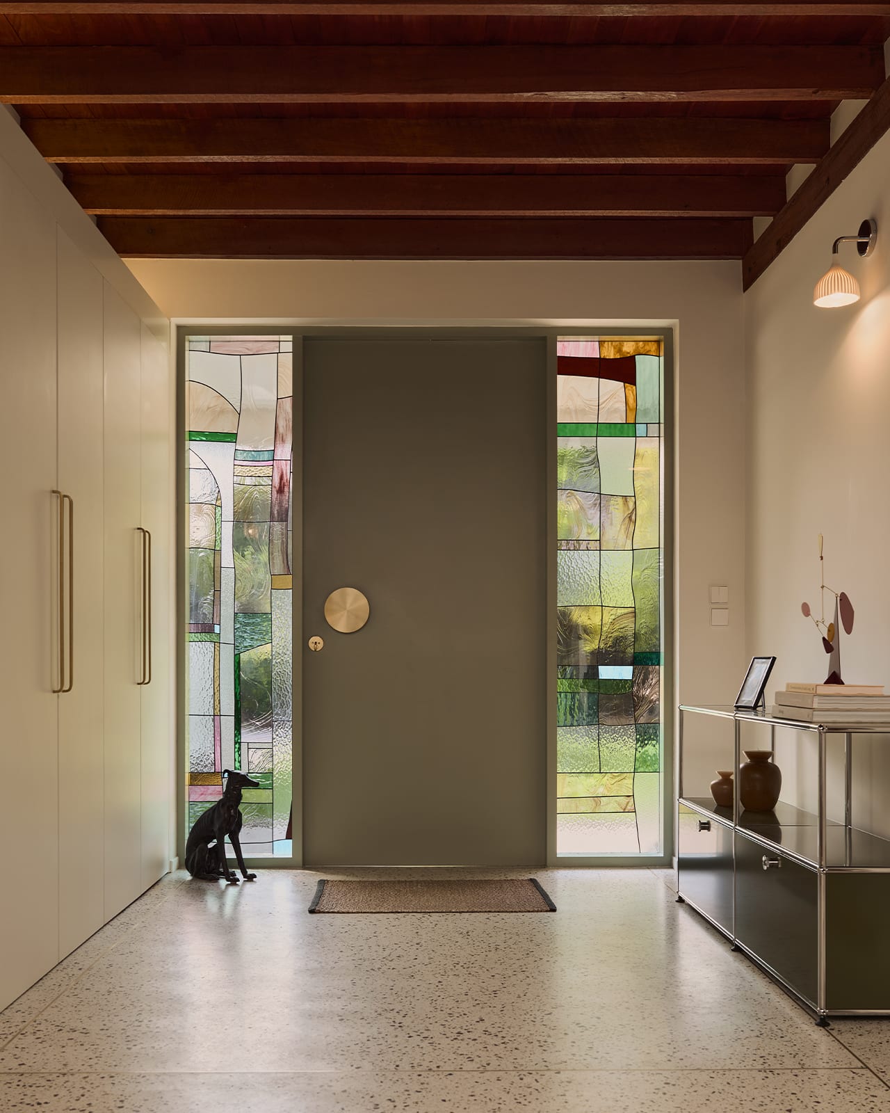 Chooduang also added a personal touch, setting a tone of conviviality from the moment one enters. He designed stained-glass panels flanking the pale-green front door, which the owner accented with a brass doorknob she had purchased.