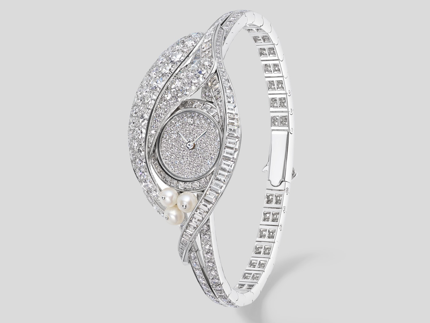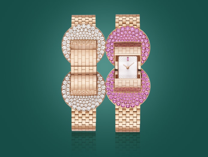 If you think that only high jewellery houses are getting in on the action, think again. Looking back to the black corded Reversos of the 1930s, Jaeger-LeCoultre’s pink gold Reverso Secret necklace features a supple chain studded with diamonds — no small feat considering the minuscule size of each link. The watch’s dial is further paved with diamonds, while the reverse side (the case back) features an intricate geometric pattern that employs meticulously set diamonds and onyx elements. No surface has been left untouched with even the convex sides of the case dressed in gems: Over 3,000 diamonds adorn this watch, requiring over 300 hours of gem-setting to bring to life. Two onyx pendants complete the picture, resulting in a design that will have time swing gracefully with your every move.