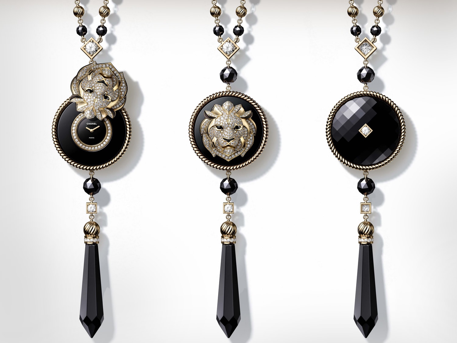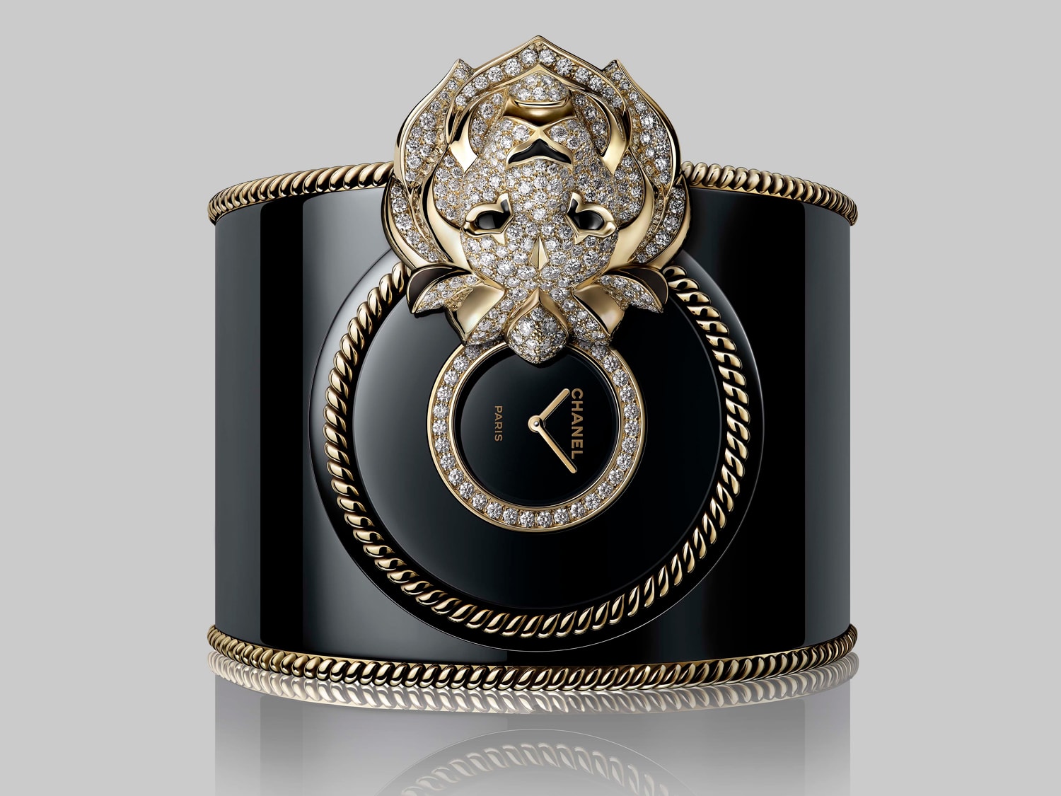 Chanel’s Mademoiselle Prive Lion collection, for instance, treats time like a precious secret that’s only revealed to a privileged few. Honouring Gabrielle Chanel’s star sign (she was a Leo), the creations bear three-dimensional buttons that rotate to unveil their time-only dials. On the formidably sized unique cuff, a gold-sculpted, onyx-eyed lion takes pride of place and makes for an impressive sight. The sparkling diamonds that stud its face contrast with the smooth, gleaming surface of its black-coated titanium cuff band. The same wow factor is found on its sautoir counterpart, which is completed by a chain rich with facetted black onyx, yellow gold spheres and brilliant-cut diamonds. An onyx graced with a solitary diamond adorns the pendant’s back.