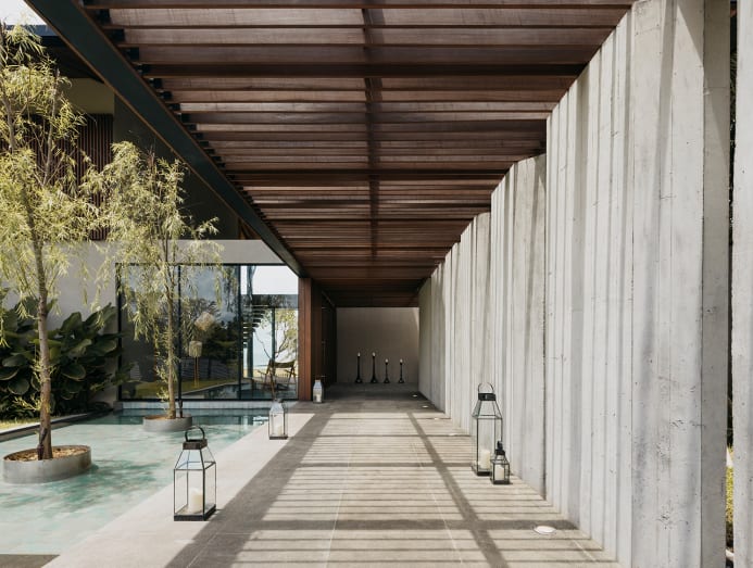 It begins with a long passageway after the drop off. “When you are walking through this space, you don’t get the full view of the sea yet. It is just a beautiful corridor with a reflecting pond and trees on one side with a tiny glimpse of the ocean,” described Yap. A timber pergola animates the path with daylight that also creates speckled textures on the pond’s surface.
