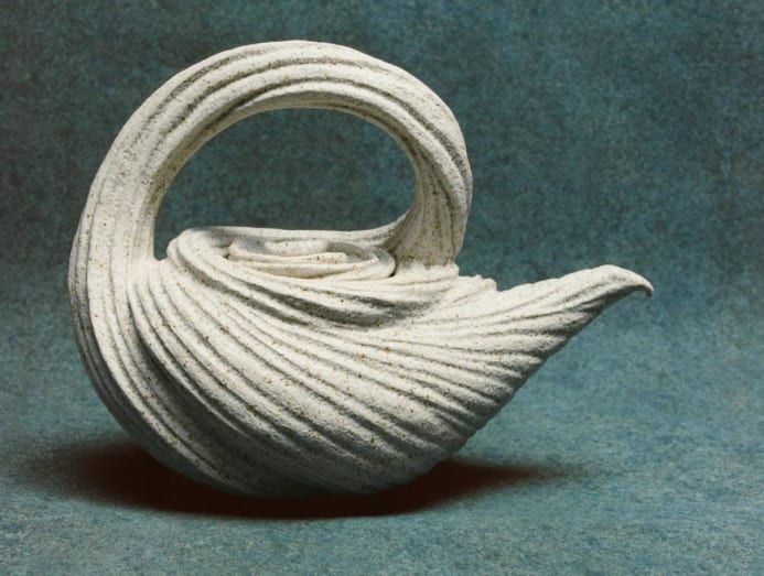 Born in 1958 in Shizuoka Prefecture, Japan, Takayuki Sakiyama’s fluid creations give them a distinct sensuality, as if they are frozen in mid-motion. They embody the personality of the sea and waves, which is a consistent source of inspiration. Likewise, Sakiyama’s teapot has the different parts of a teapot contained in one elegant swirling stroke.