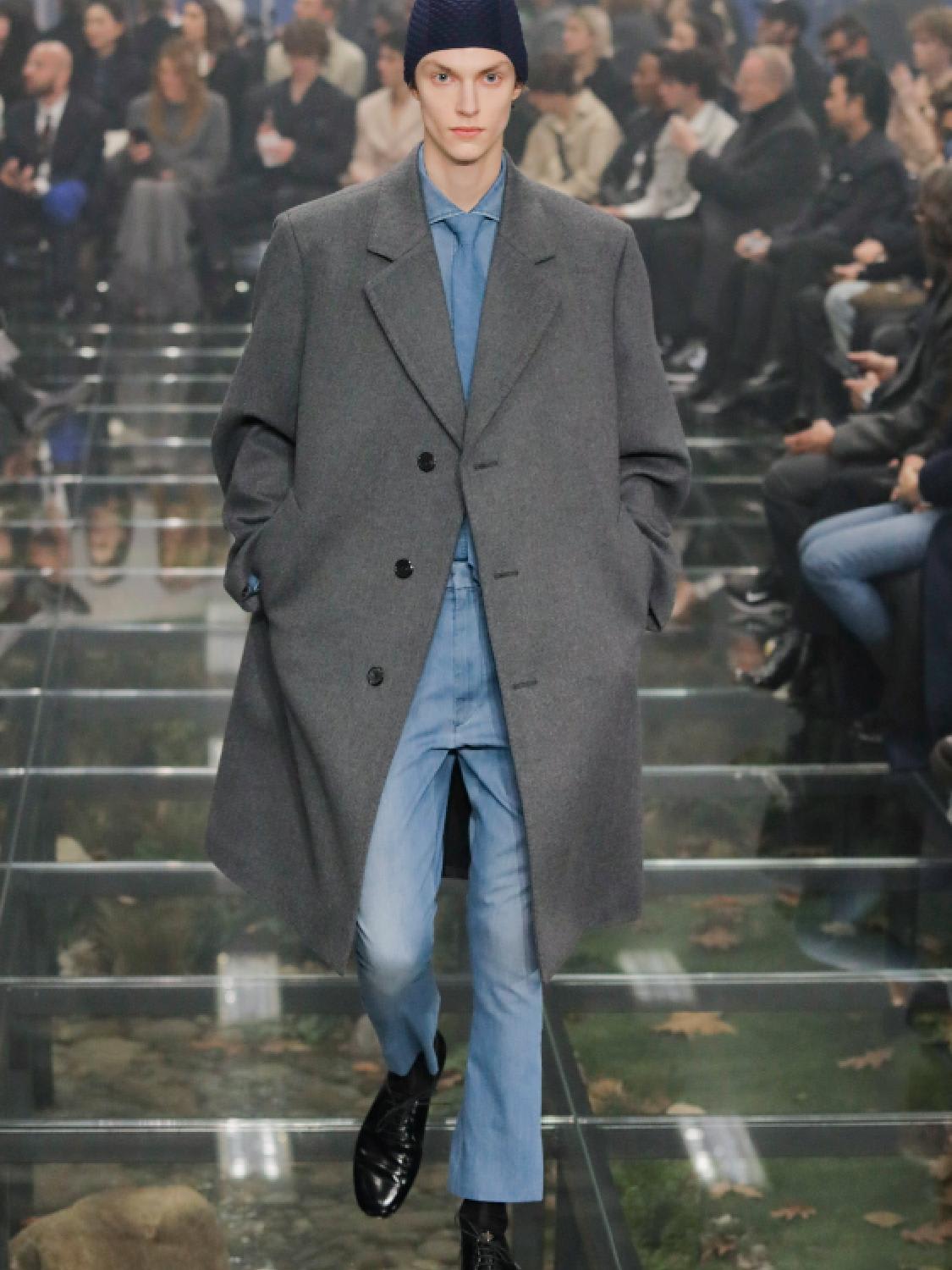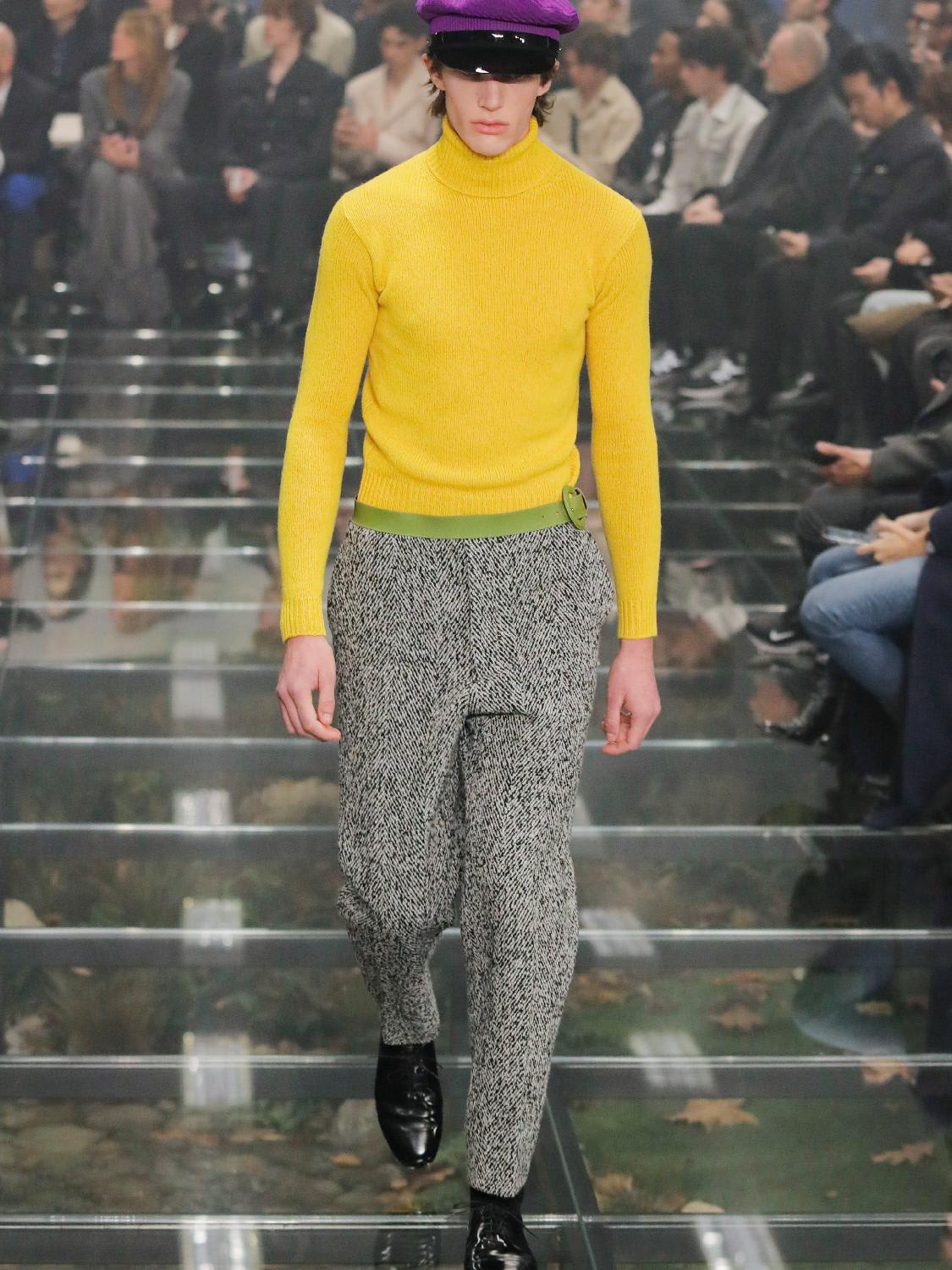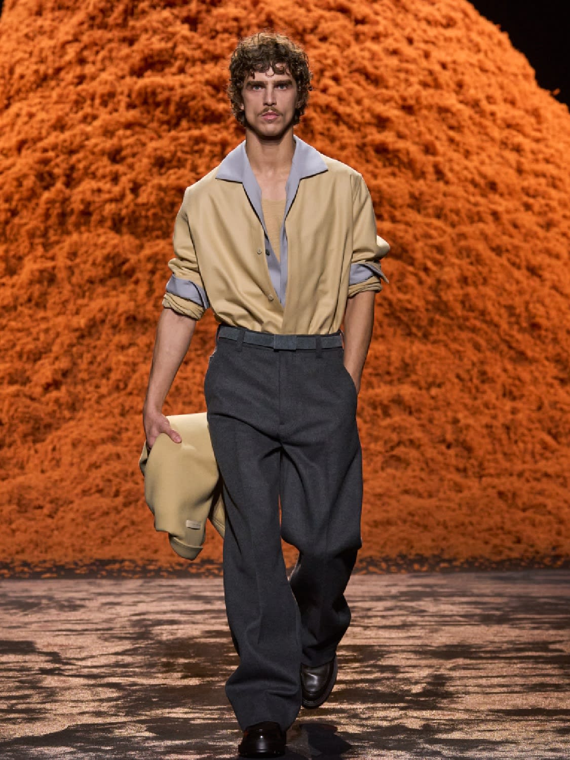 To showcase the brand’s expertise in cashmere and other innovative fabrications, Zegna’s collection was paraded around a mini hill of saffron cashmere tufts, with more fluffing down as the versatile and cosy looks came ambling out in a blend of the classic and the contemporary. Who wouldn’t want to live in a cashmere world?