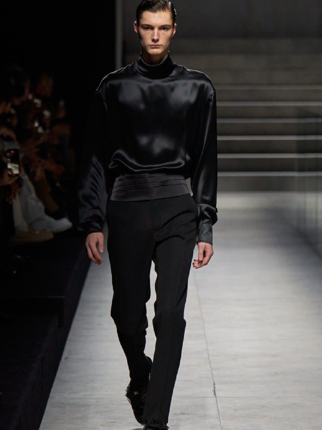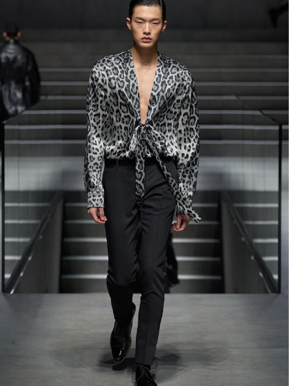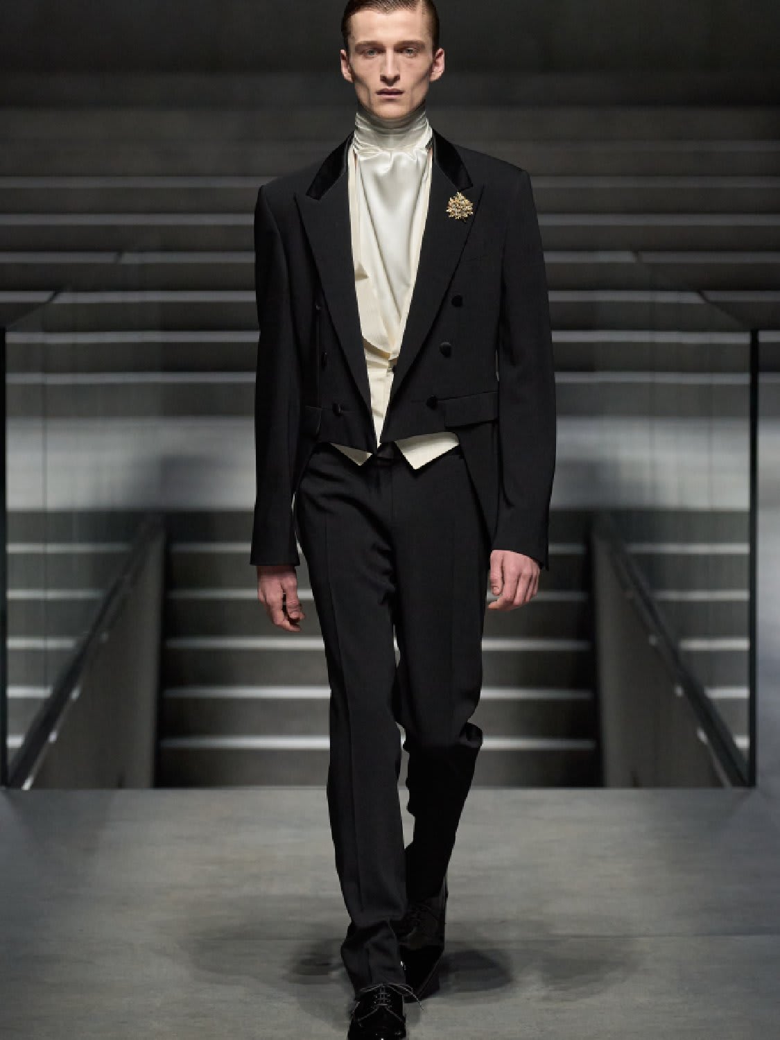 Another way of creating a sense of the familiar and security is to look back on the masculinity of the past, and designers Domenico Dolce and Stefano Gabbana’s offered up richly elegant looks fit for a period drama – right down to a pump with an exaggerated grosgrain bow.The severe, predominantly black monotone of the entire collection heightened the sense of a world before colour films – this was the escapist world of a Luchino Visconti (Italian filmmaker), all silken surfaces and wealth. There were unapologetically glamourous coats, glossy leather blousons, gleaming silk shirts with high necks or plunging decolletage, poet blousons tied with a bow, shimmering suits with cummerbunds.