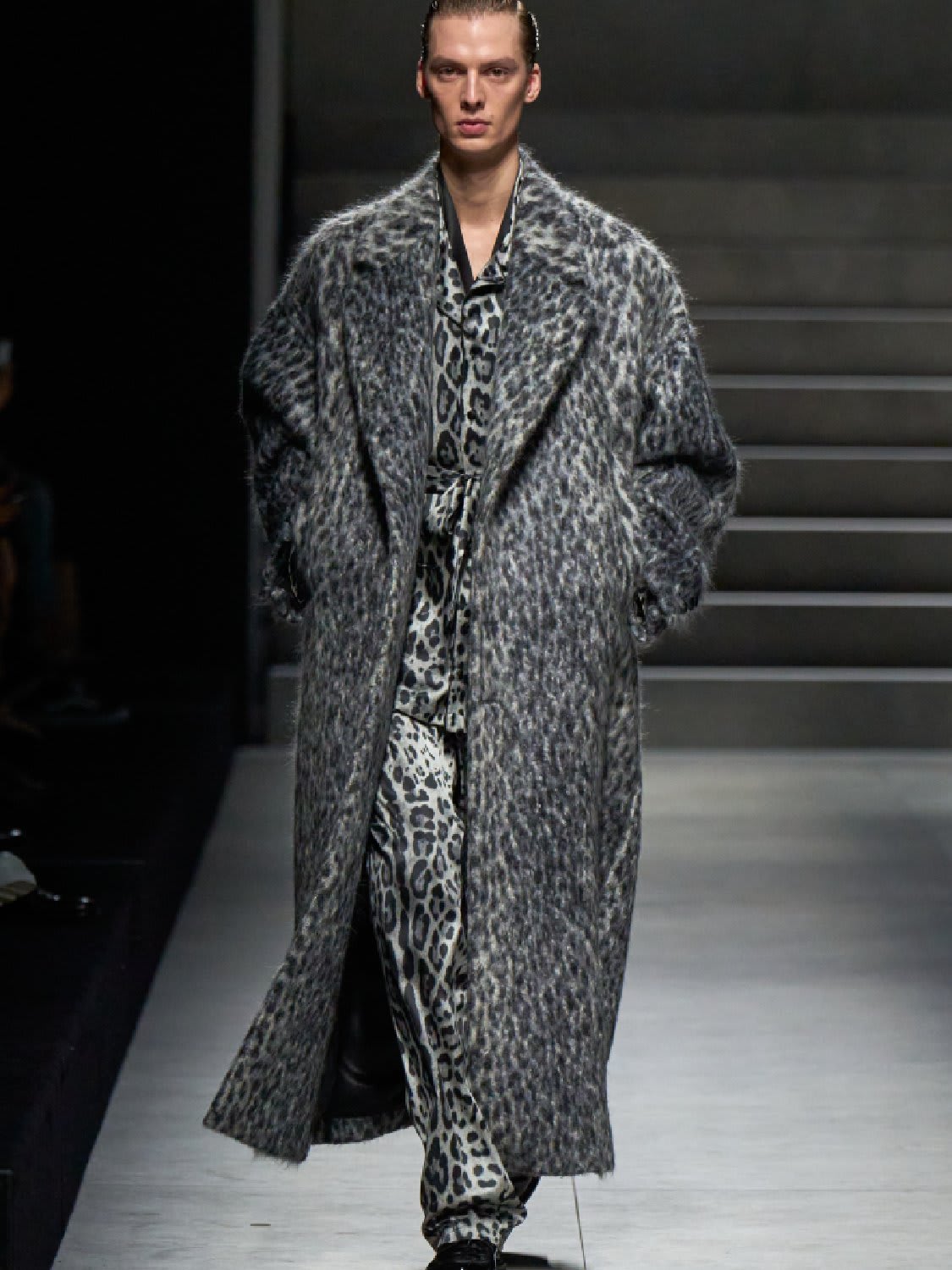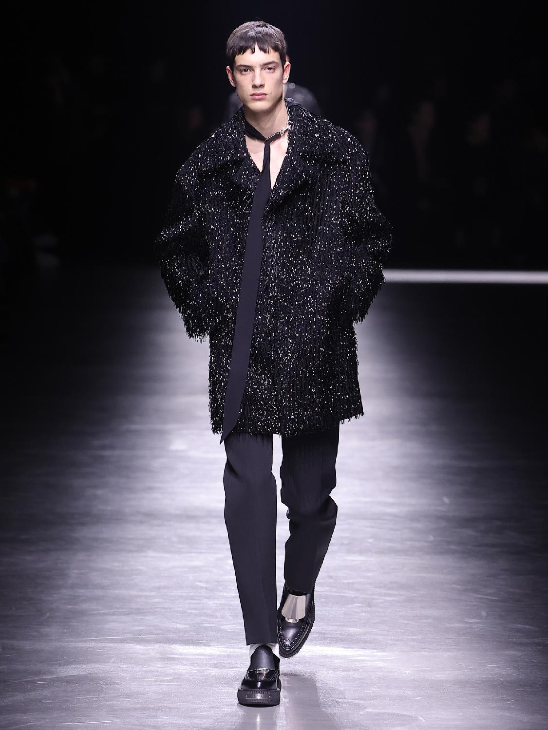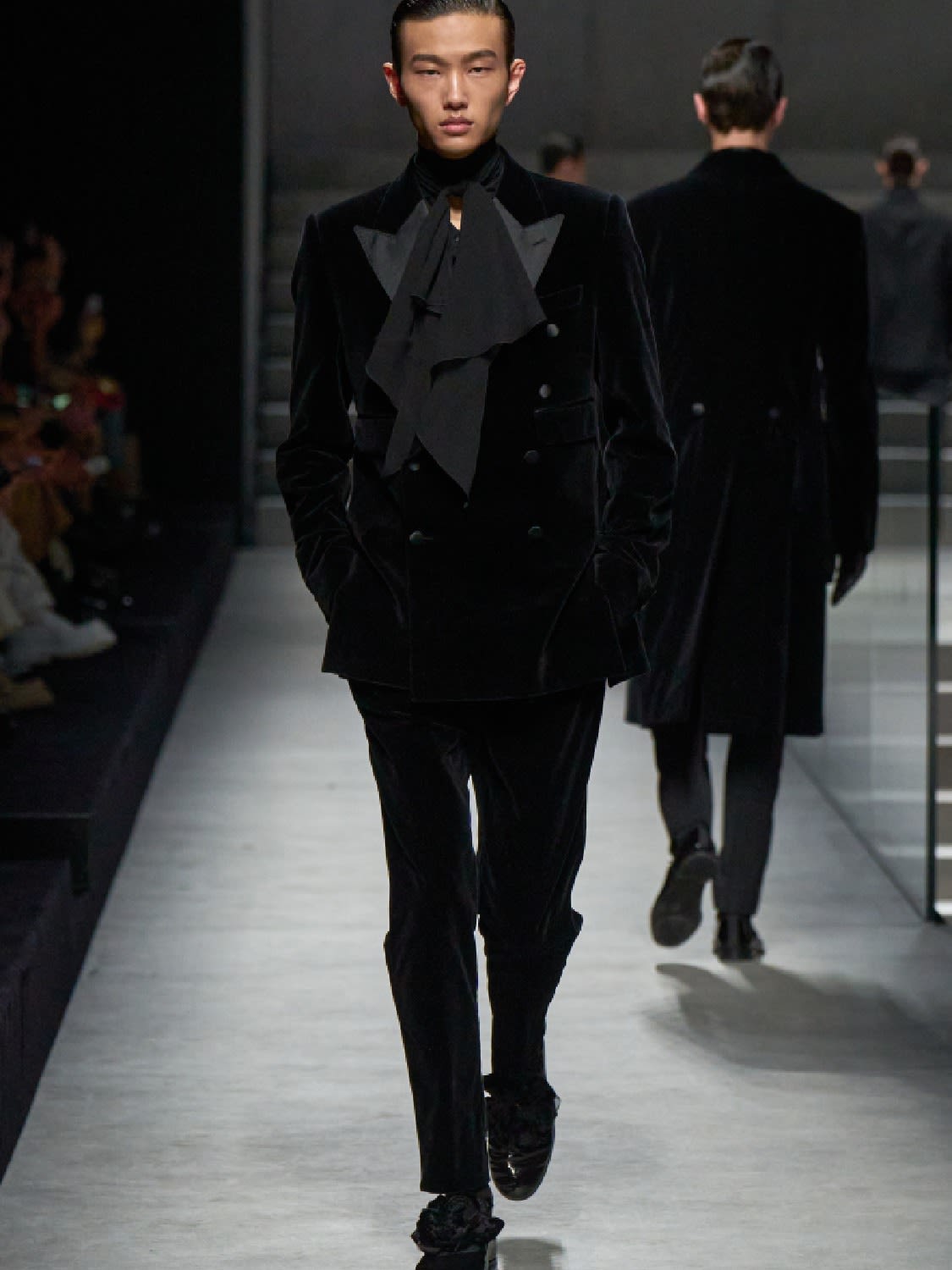 Another way of creating a sense of the familiar and security is to look back on the masculinity of the past, and designers Domenico Dolce and Stefano Gabbana’s offered up richly elegant looks fit for a period drama – right down to a pump with an exaggerated grosgrain bow.The severe, predominantly black monotone of the entire collection heightened the sense of a world before colour films – this was the escapist world of a Luchino Visconti (Italian filmmaker), all silken surfaces and wealth. There were unapologetically glamourous coats, glossy leather blousons, gleaming silk shirts with high necks or plunging decolletage, poet blousons tied with a bow, shimmering suits with cummerbunds.