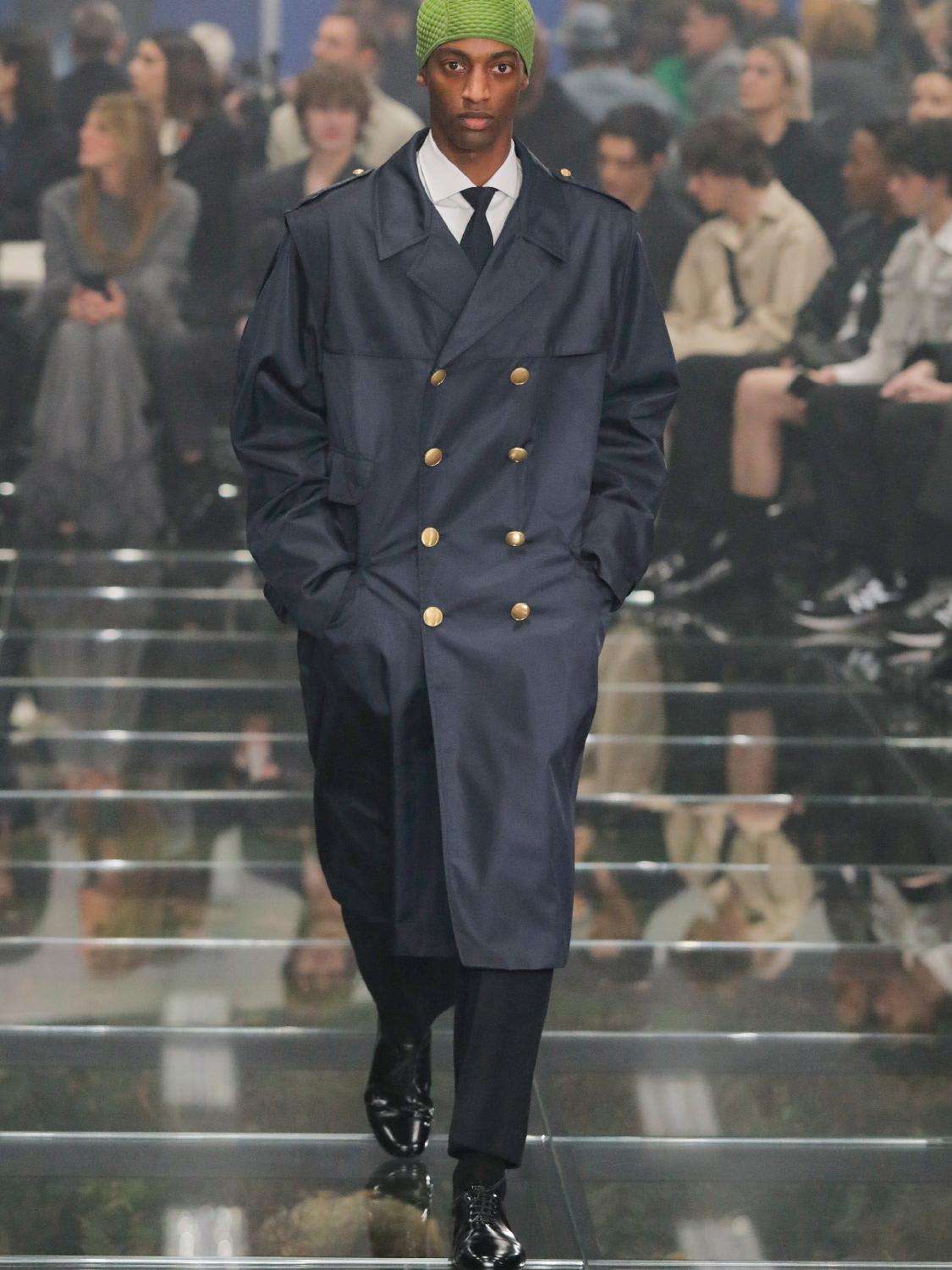 Updated in endless array, jackets, trousers, and great coats with generous volumes, sailor jackets, gilets and peacoats have a raffish sea captain charm. Shirts are replaced by tops in the same fabrics as blazers in a new uniform that feels decisive and authoritative. Utility garments such as dungarees and work shirts nod to the “athleisure” genre, unadorned, save for snaps, zips, flaps and sailor charm, while the ever-present sharply tailored work suits in tweed, pinstriping and flocking, always in a single colour, cater to the gentlemen office worker. Keeping this 100-plus look collection cohesive is the restrained palette: A wine-dark mix of navy blue, steel grey, ice white and midnight black, as sombre, and ominous as a gathering of the clouds of war.
