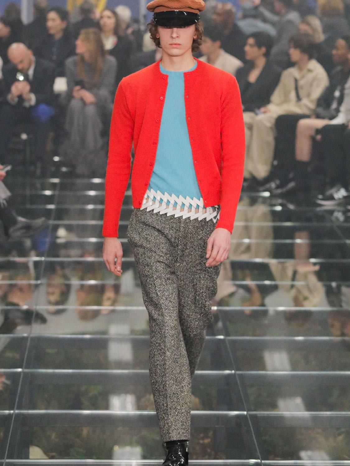 The Raf Simons and Miuccia Prada-designed collection added interest with a playful sense of colour (for example, red pants with a yellow belt and purple cap), and novelty touches in its accessories, for a quick hit of dopamine. There were knitted balaclava hoods, skull caps and swim caps, as well as goggle specs, wide belts, and strappy sandals to enliven an otherwise traditional menswear offering. In present difficult times, our emotional instinct is to attach to that which is familiar, and seek a kind of permanence in what we surround ourselves with, and Prada has offered a reiteration of traditional shapes and styles, something that will bind you the solidity of men’s fashion history.