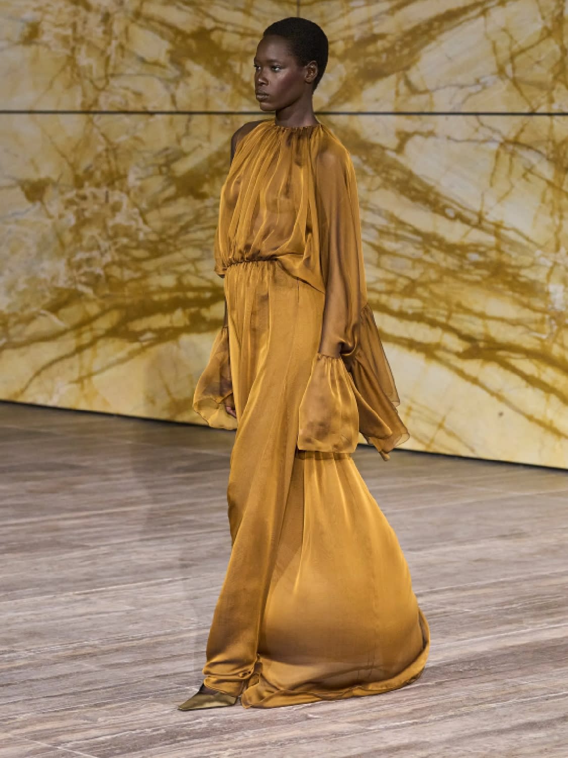 It was a collection as fresh and strong as the YSL collection of 1968, modelled so memorably by Veruschka von Lehndorff, who wore the front-laced safari tunic with a gun.
