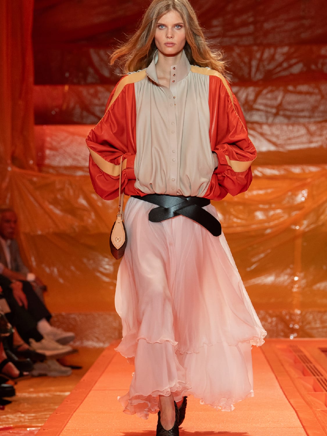 Having shaped Louis Vuitton’s womenswear for over a decade, this latest collection vrooms with confidence and it is a clear expression of his design language and genius. The leather bomber jackets and the varsity blouson, which have become his signature, had 1980s brio. Many of the tops and brass band coats had the bold shoulders, studded double-breasted, and glitter, of that era, worn with high-waisted tapering pants, which come straight out of 1982 – exactly what Sheena Easton would have worn to belt out 9 to 5 (Morning Train). Ruffled skirts and cowled silk blouses, huge hip slung belts, felt like the New Romantics all over again. It was Boy George, Duran Duran and the beginning of the aesthetic that defied gender conventions.