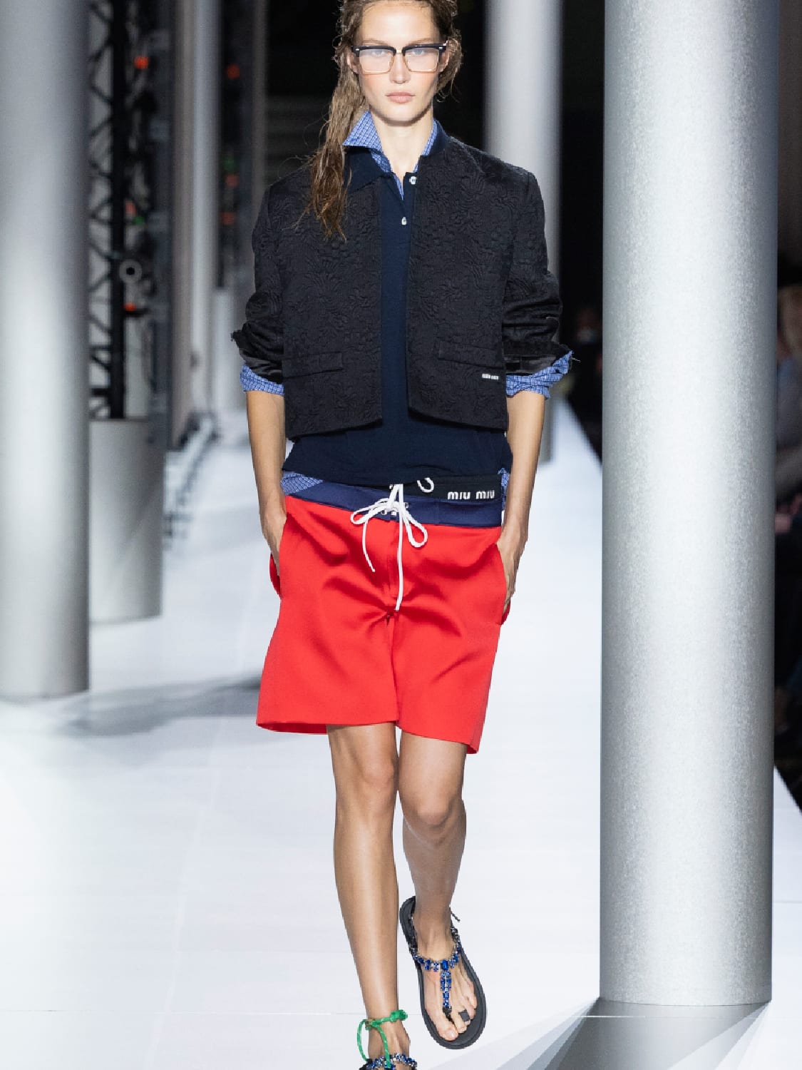 It takes a designer at the height of her power to express her aesthetics with such clarity and concision. Miuccia Prada has always been about the surprising beauty and charm of clashing unlikely genres, of which this collection is a fine example. The surprising focus is the sports jock, with primary-coloured polo-necked shirts, and brash waist-banded looks, a Tommy Girl with low-rise board shorts. Ingeniously, these gym bunny clothes were then layered with shirts and suiting of a retired academic, and then in turn V-neck sweaters and librarian cardigans. On top of all this, the coup de grace of gold brocade dresses, glitter and gold floral embroidery. “Want it now” can’t begin to express the Miu Miu x New Balance athletic thong sandals, just as nerd-chic doesn’t even come close to describing the originality of this vision.
