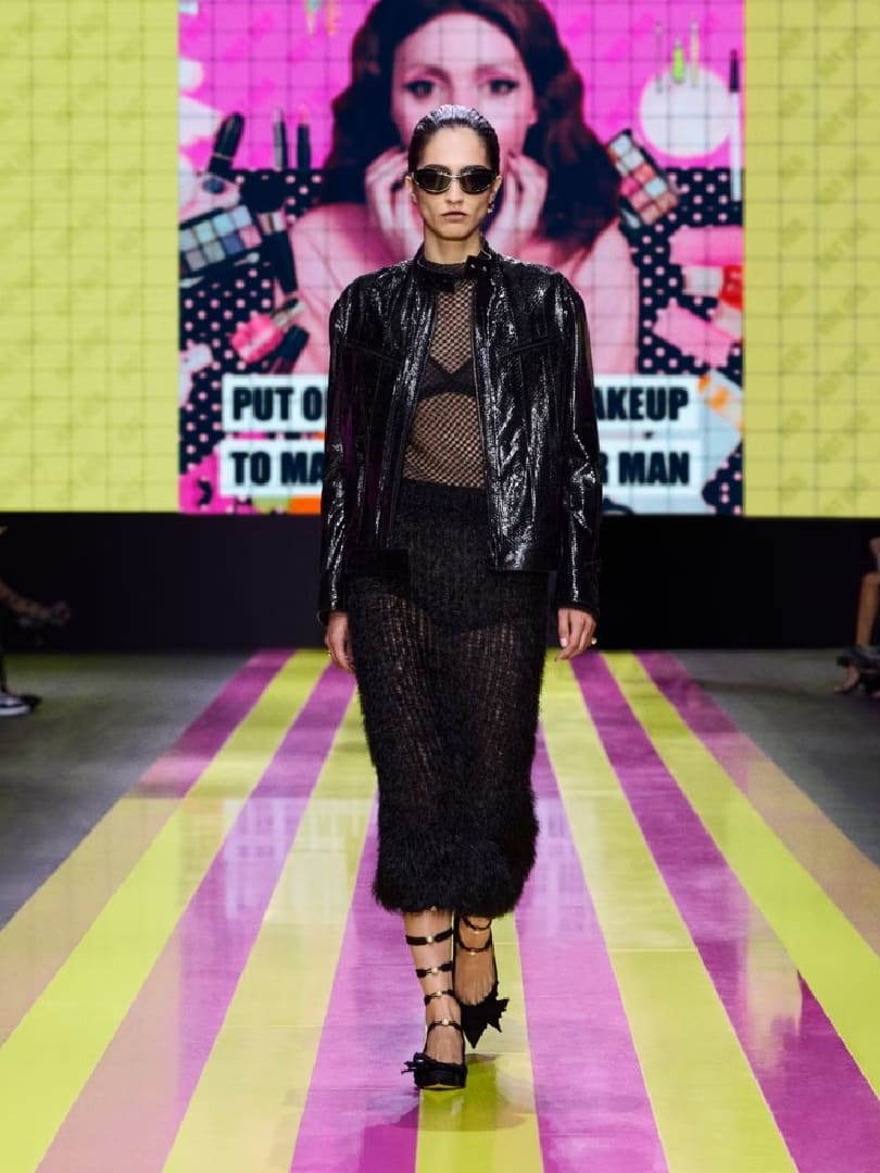 Female empowerment was also seen as a grey denim jacket with burn-mark trim (witches were burnt at stakes?), and a plethora of black net dresses showing off prim bras and panties. The latter item is a Grazia Chiuri signature.