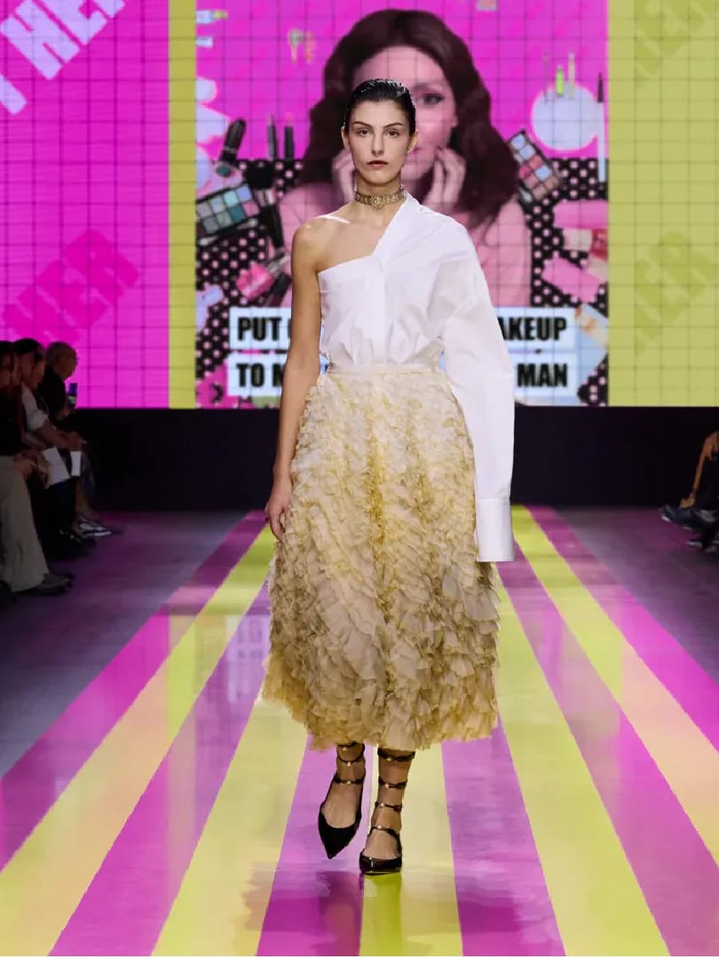 Plastered across the Barbie-coloured walls of the show were gigantic statements such as “I Don’t Belong To Anyone Else”, “My Body Is Not A Product” and “I Am Not Your Doll” etc. Today’s feminist, Grazia Chiuri proposes, wears a version of the Dior codes in a somber palette ‒ its renowned tailoring in blacks and smoke and khaki; white shirts and slouchy trousers; pleated skirts and bar jackets; cinched waists; wafts of tulle on graceful gowns. You could read a note of rebellion in some asymmetric looks, shirts and jackets with only one shoulder.