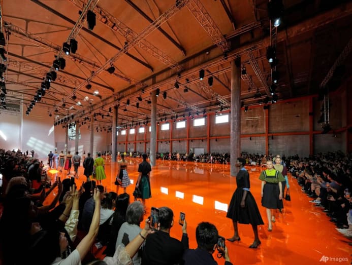 Prada's cavernous showroom was awash in bright orange paint Thursday (Sep 25) for a women's collection that swerved from cocooning to revealing, rigorous to feminine.