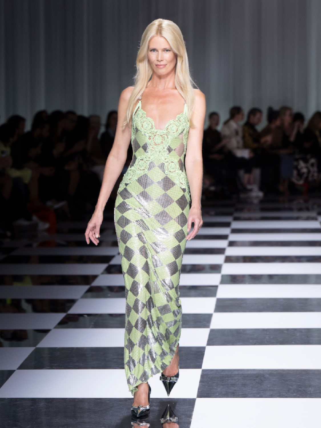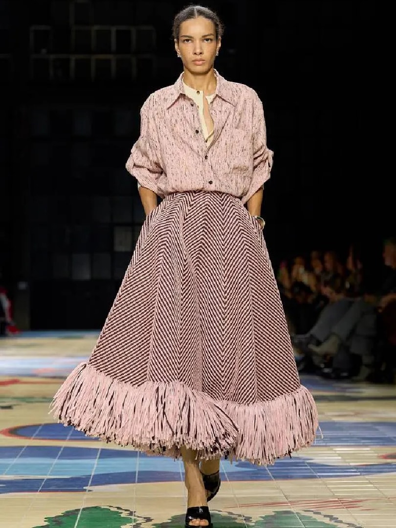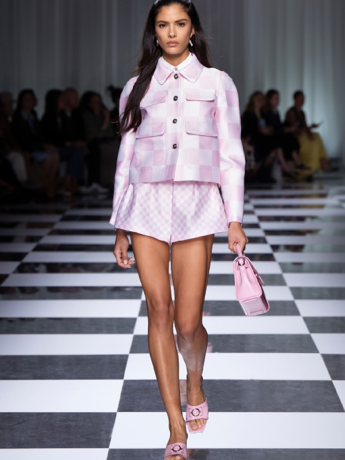 Quiet luxury be damned – this was Versace’s signature audacity down to the lime green checker box print. In truth, the sugar almond pastels did the heavy lifting here, redefining minimalism as joyful rather than safe.