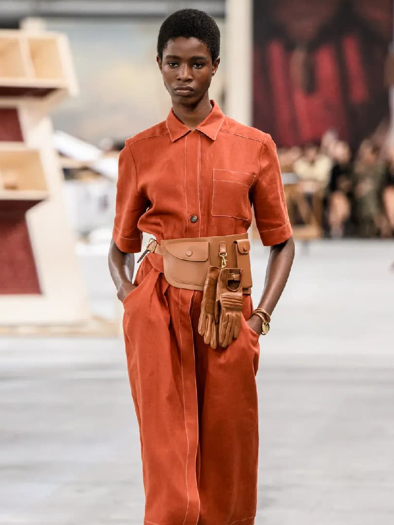 Then there were the tweeds that became sculptural dresses, suits and coats. Of course, there was leatherworking techniques, this being a leather house: Strips of leather got pieced together into sensuous cowled tunics; leather “banana leaf” sandals; papoose bags and the wide trousers, oversized blousons and fishing baskets – everything in leather.
