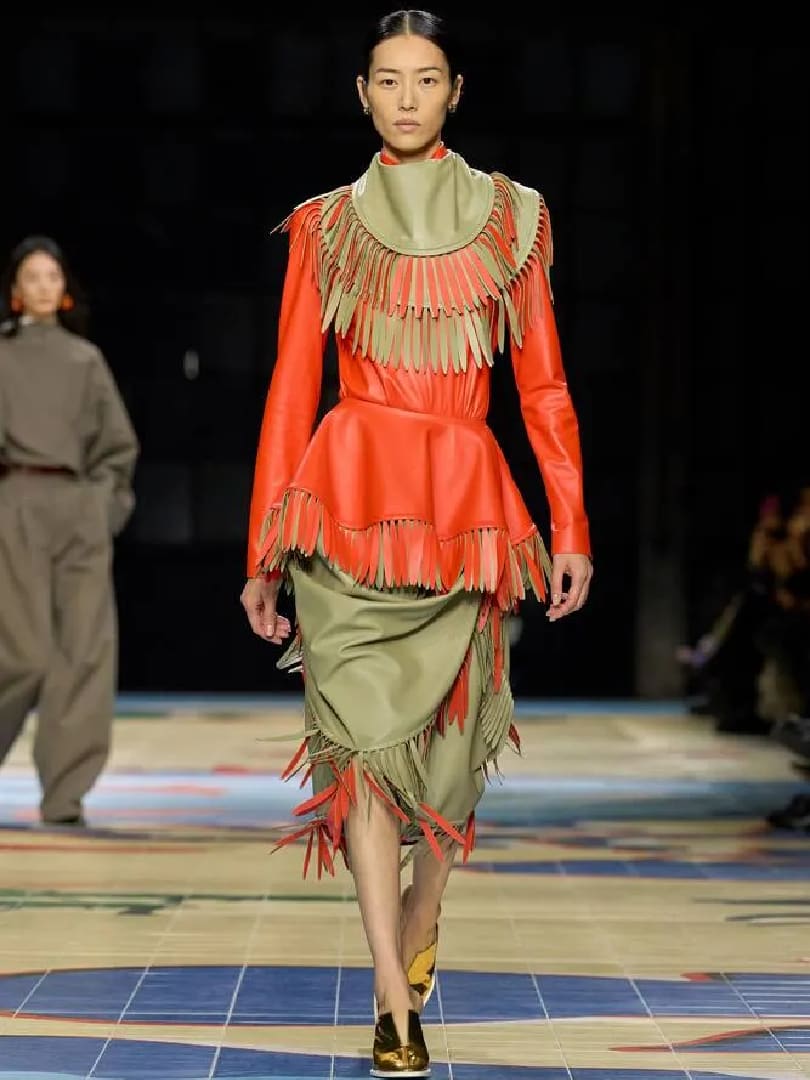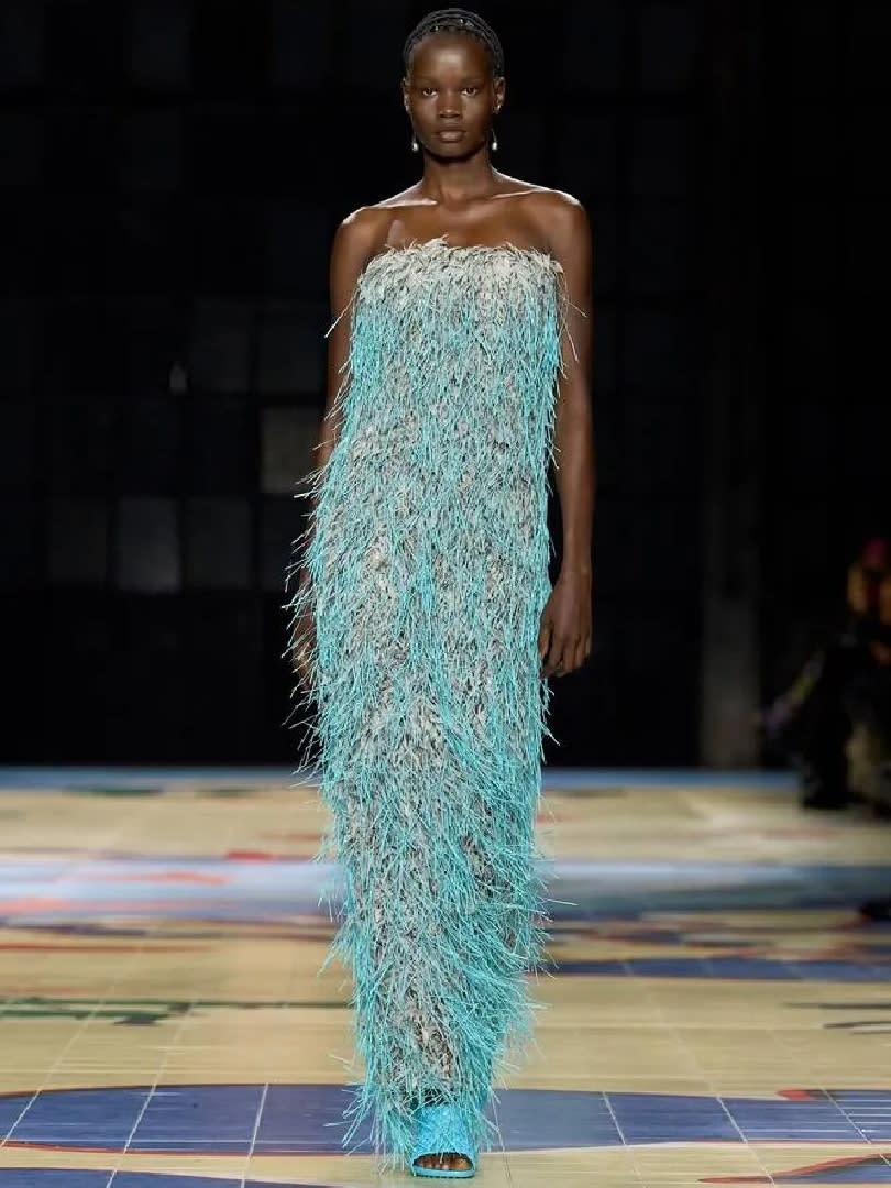 It was everything, everywhere all at once for Matthieu Blazy’s third collection for the brand. This was an absolute tour de force of all the incredible craftsmanship traditions of the world. The house’s leather intrecciato technique (rattan weaving is prehistoric, and predates pottery) was used to make a large “straw” bag, among various dazzling interpretations, before Blazy went on to explore other weaving methods. These then resulted in items of glorious strangeness: Knit net dresses with huge pompoms, shaggy Paul Poiret coats trimmed in tufts or fringe (fringe again!).
