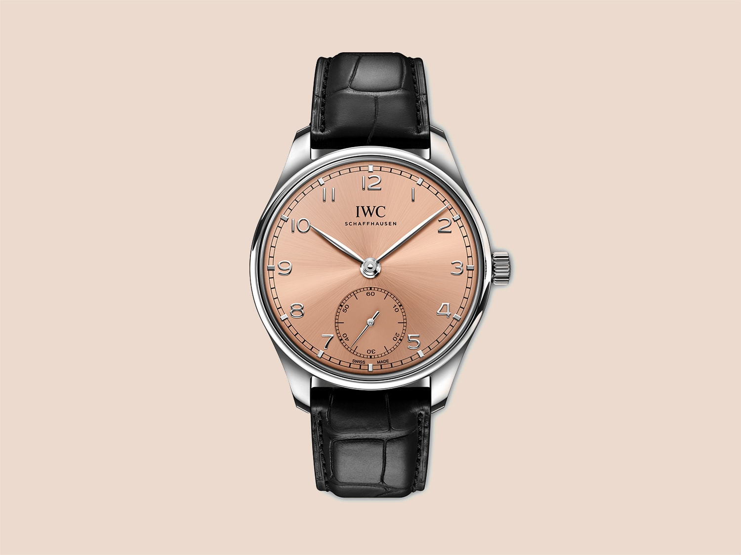 If you’re after a watch with more girth, IWC Schaffhausen’s newest Portugieser Automatic 40 should do the trick. Like the precursors that were launched in 2020, this steel Portugieser bears a 40.4mm case that houses IWC’s self-winding 82200 calibre with ceramic components (for added durability) and a 60-hour power reserve. The dial design remains unchanged, with slender leaf hands pointing towards rhodium-plated applied Arabic numerals and markers, and a small hacking seconds counter at the six o’clock position. The salmon hue, however, completely transforms the watch’s looks and adds a new facet to a collection already graced with red, blue and green dials.