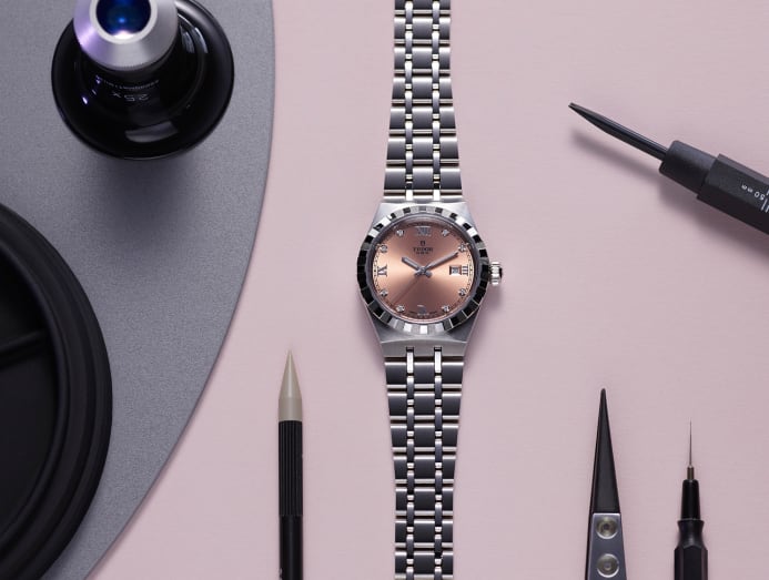 Also found in this category are the new Tudor Royal watches. Available in four sizes — 28mm, 34mm, 38mm and 41mm — the 1950s-inspired automatic timepieces come with various design features that include metal choices (steel or yellow gold bi-colours), diamond-set bezels options, and several dial preferences: In addition to mother-of-pearl, there are sunray-brushed dials that introduce salmon and chocolate brown to the range. Baton hands with Super-LumiNova and integrated bracelets complete the picture.