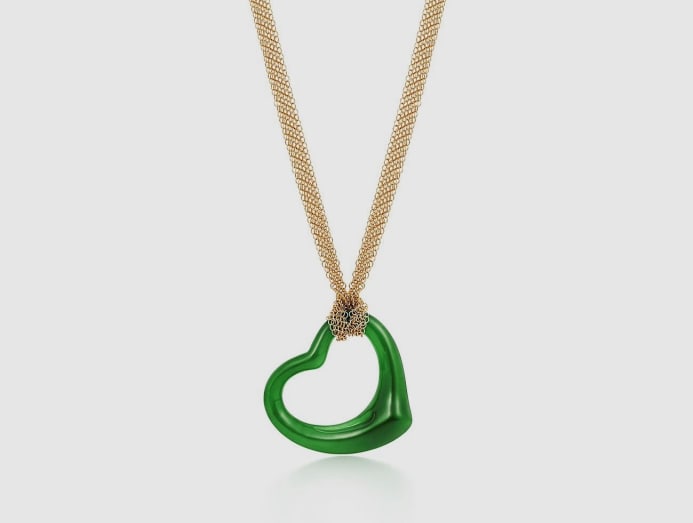 Here’s something a little more unique. This Tiffany & Co necklace, an original Elsa Peretti design, features a heart-shaped pendant made of green jade, hung on an 18K gold mesh chain.