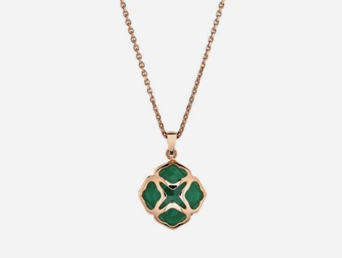 For something a little more feminine, this Chopard Imperiale Cocktail pendant features a finely woven lattice shaped in a floral motif. Made of rose gold, it delicately encases a striking green agate stone, symbolising strength and courage.