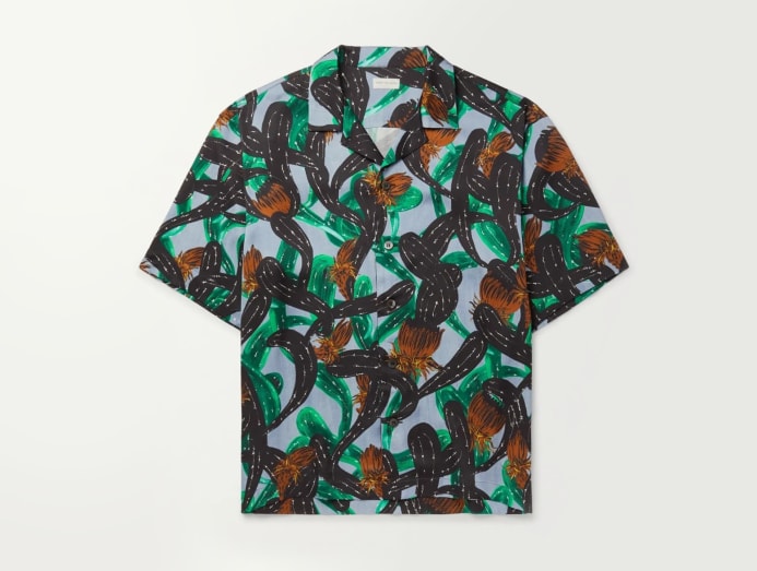 This cotton-jersey printed shirt from Dries Van Noten’s SS21 collection, for instance, is full of upbeat and tropical motifs. Decorated with flowering cacti, it has an aloha-style cut which promises a comfortable fit. The bold design is balanced with cool tones, so you can command attention without screaming for it.