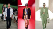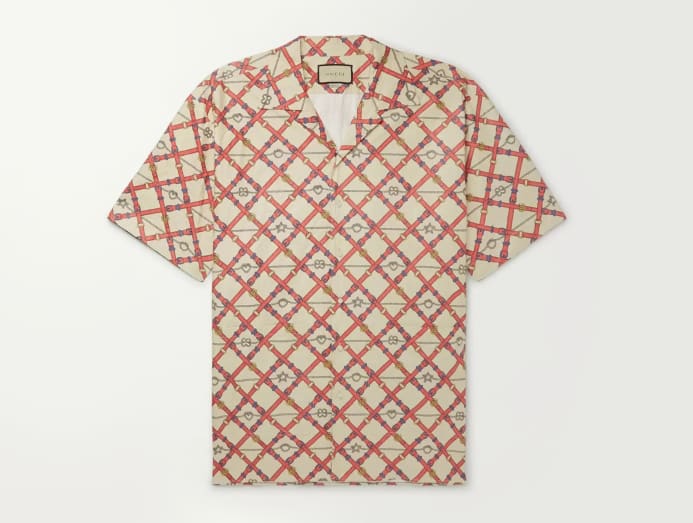 Take this oversized Cuban-collar crinkled shell shirt from Gucci. Its baggy and relaxed style makes for easy wearing, and the print of a checkerboard of belts, each fastened with the house's signature GG buckle, is subtle yet distinctive.