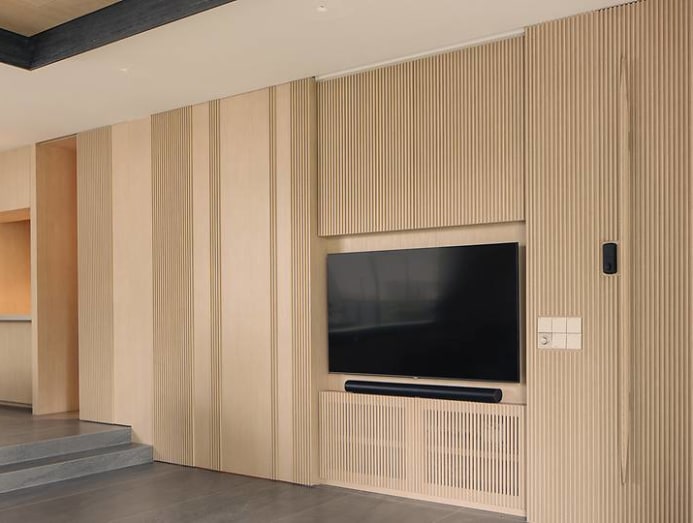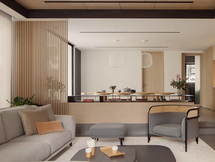 It belies the warm interior that Ko has created, with plenty of light-toned wood for both the architectural features and cabinetry. The client, who was inspired by the serenity of Japanese homes, leaned toward this palette. A screened wall using oak laminate with rhythmic vertical articulations concealing the main door opens to a living room floored with large, ashen-coloured ceramic floor tiles.