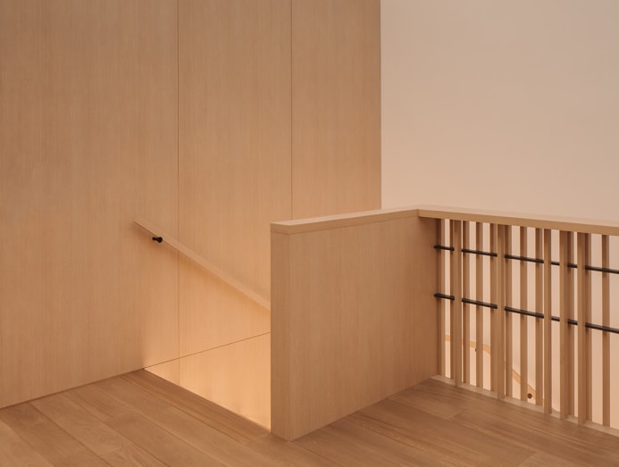 The staircase walls and floor employ the same palette of light oak timber laminate cladding and black metal handrails. The vertical slat detail continues on one side for visual consistency, drawing the eye up and inward, as well as bringing the sense of calm from the first storey to the more private zones upstairs.