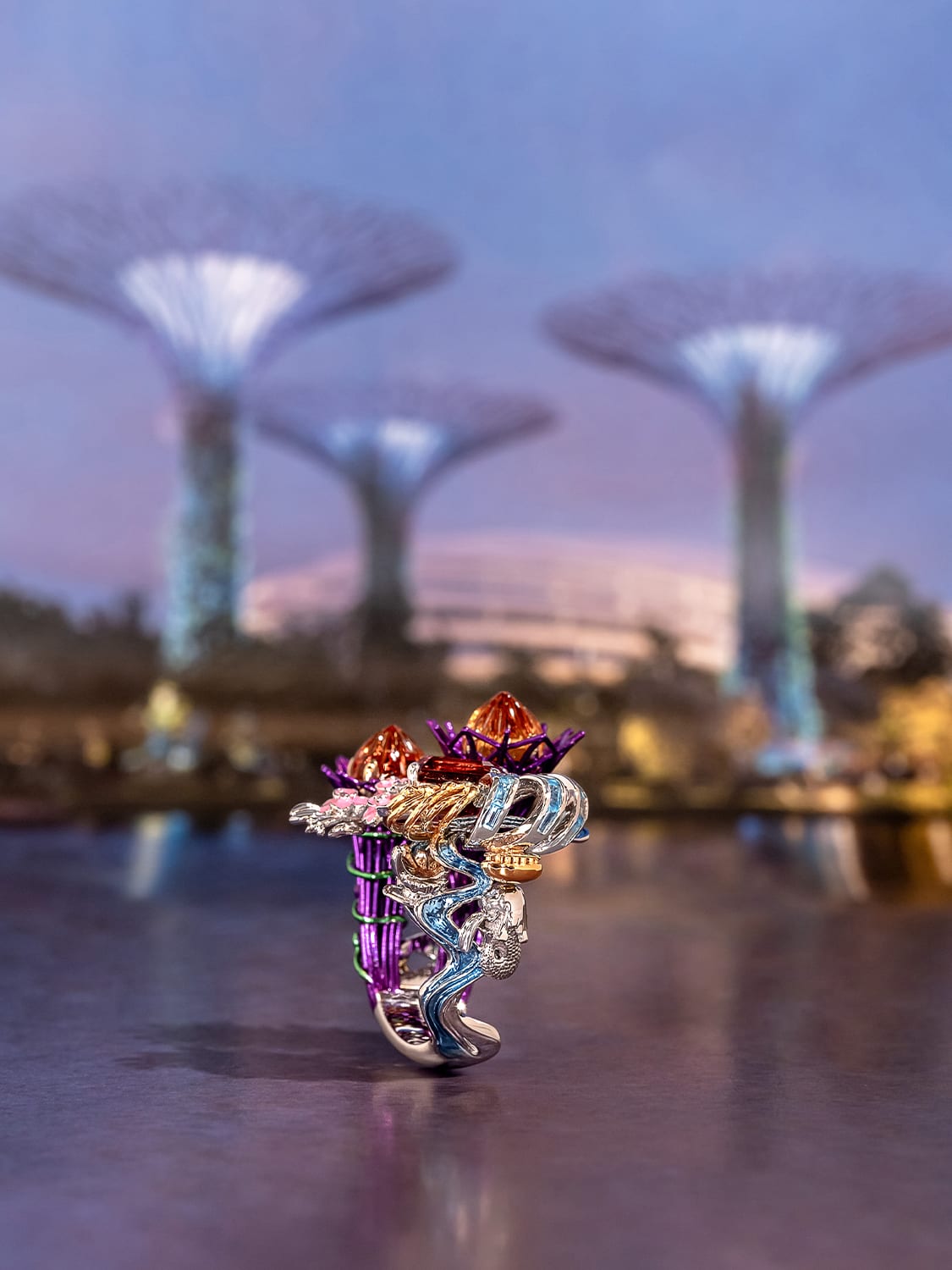The twin golden citrines, totalling 4.7 carats, evoke the soaring Supertrees of Gardens by the Bay, while a 2.6-carat orange sunstone captures the warmth of Singapore’s perpetual sunshine. This statement ring is also a miniature tapestry of the nation’s most iconic landmarks. One side of the band flows like the Singapore River, curling past other symbols of the city – an artistic rendering of the Flower Dome in rows of custom-cut blue topaz pave, the majestic Merlion, the futuristic ArtScience Museum, and a nostalgic junk boat drifting on the water. The other side rises into sculptural Supertrees.