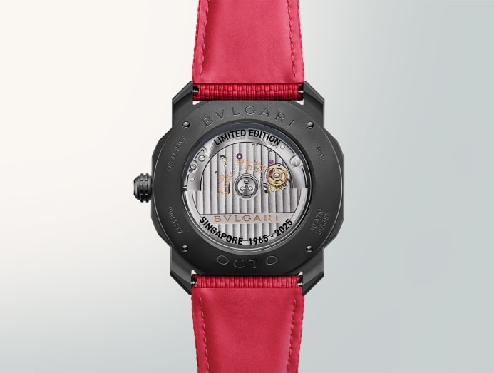 Bvlgari pays tribute to Singapore’s 60 years of independence with the Octo Roma Worldtimer SG60 Edition. Naturally, the watch draws inspiration from Singapore’s national colours. Encased in sleek stainless steel, it features a matte black dial contrasted by a red lacquered central seconds hand. Encircling it is a matte 24-hour ring, half in black and half in red, indicating day and night hours. The 24 world cities ring includes Singapore in striking red, setting it apart from the rest and reflecting its unique position on the global stage.