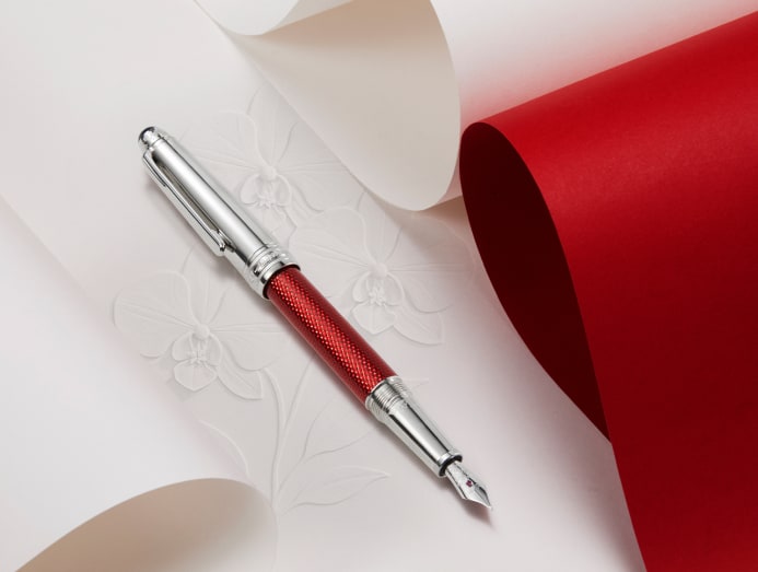 The forepart of the pen is inscribed with a finely detailed Singapore skyline, showcasing landmarks such as the Marina Bay Sands and the Singapore Flyer. Meanwhile, the rhodium-coated solid gold nib features an elegant orchid motif. Limited to just 500 pieces, the pen also features a barrel with an engraved three-dimensional hexagon pattern covered by translucent red lacquer.