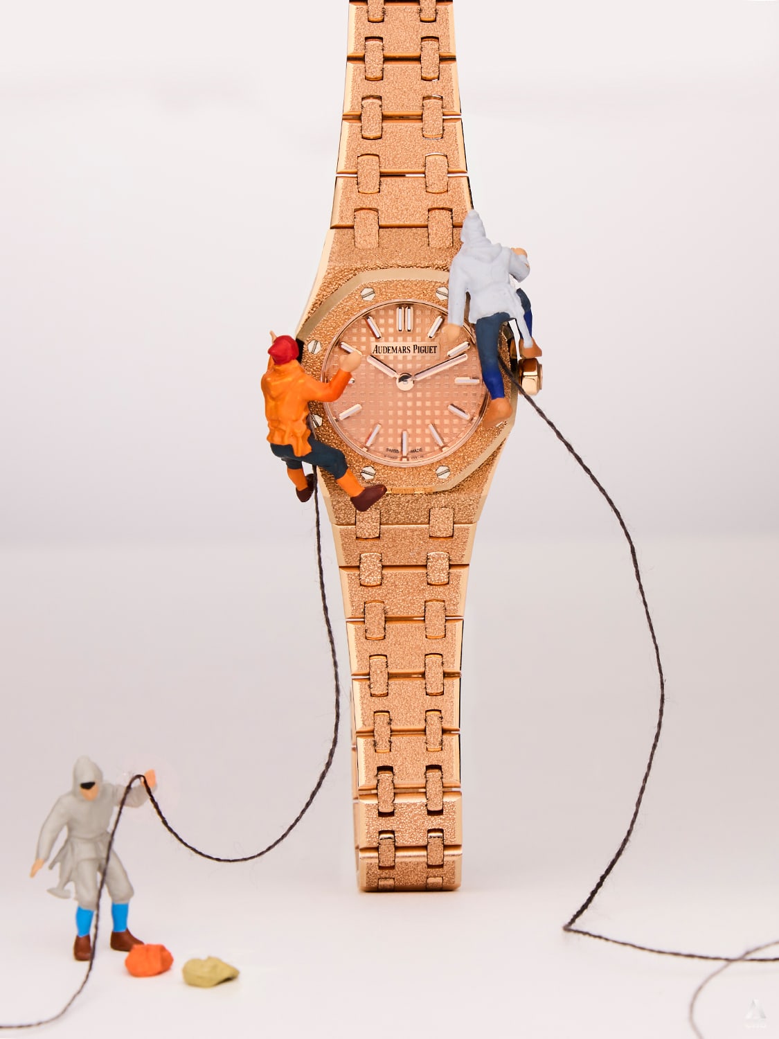 With a diameter of just 23mm, the model is a refined miniature of one of the world’s most iconic watches. There are three iterations – yellow, pink and white gold, all with a shimmering frosted gold finish. The diamond-dust effect of the frosted gold is contrasted with polished bezels that outline the individual links of the tapering bracelet, adding to the jewellery aesthetic of the model. The luminous dial features facetted gold-hour markers matching with the colour of the case and filled with luminescent material for optimum visibility in the dark.