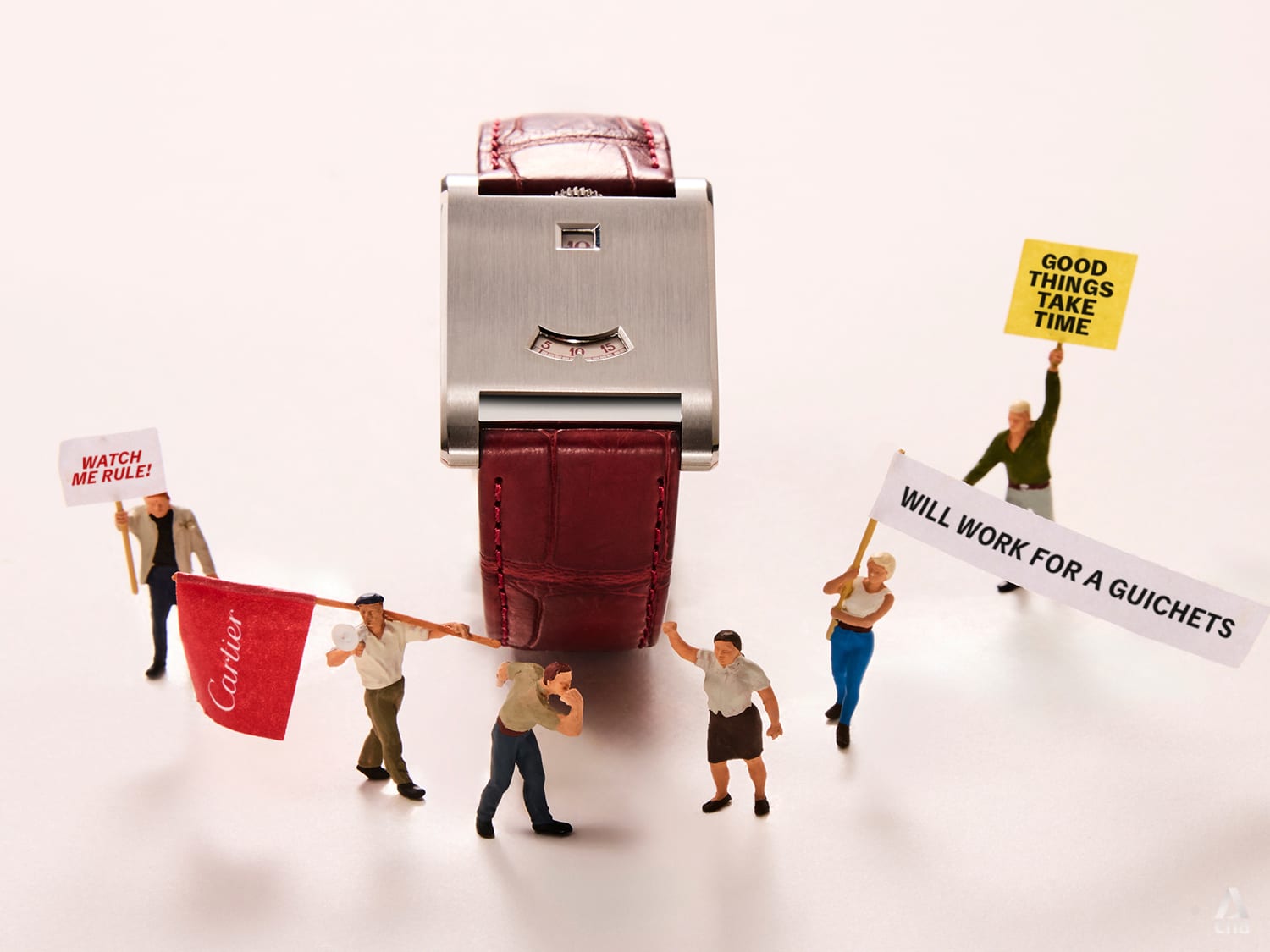 There are three models in yellow gold, rose gold or platinum. The satin-brushed finish of the case, paired with an alligator strap, lends an understated elegance to the watch. The Tank a Guichets is powered by the manual 9755 MC movement, a calibre with jumping hours and dragging minutes, crafted exclusively for this timepiece.